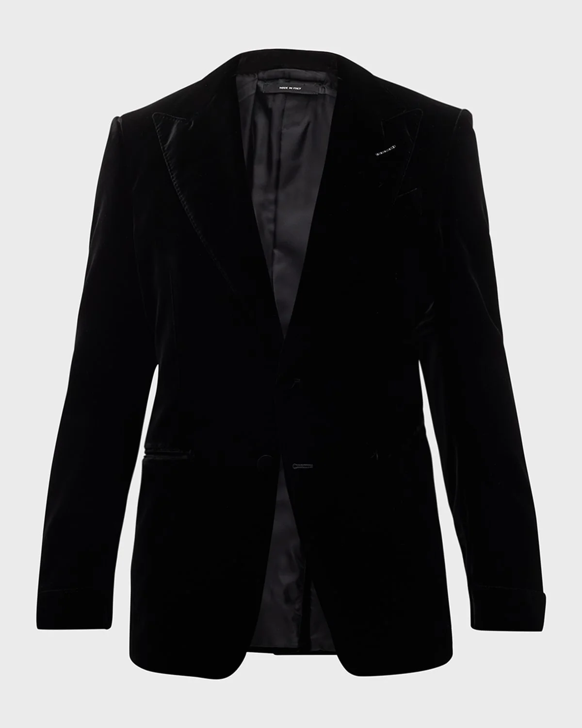 TOM FORD cocktail jacket in solid velvet Peak lapels; two-button front Welt pockets Unfinished sleeves Single back vent Wool/silk Made in Italy Model is 6'1"/185cm.