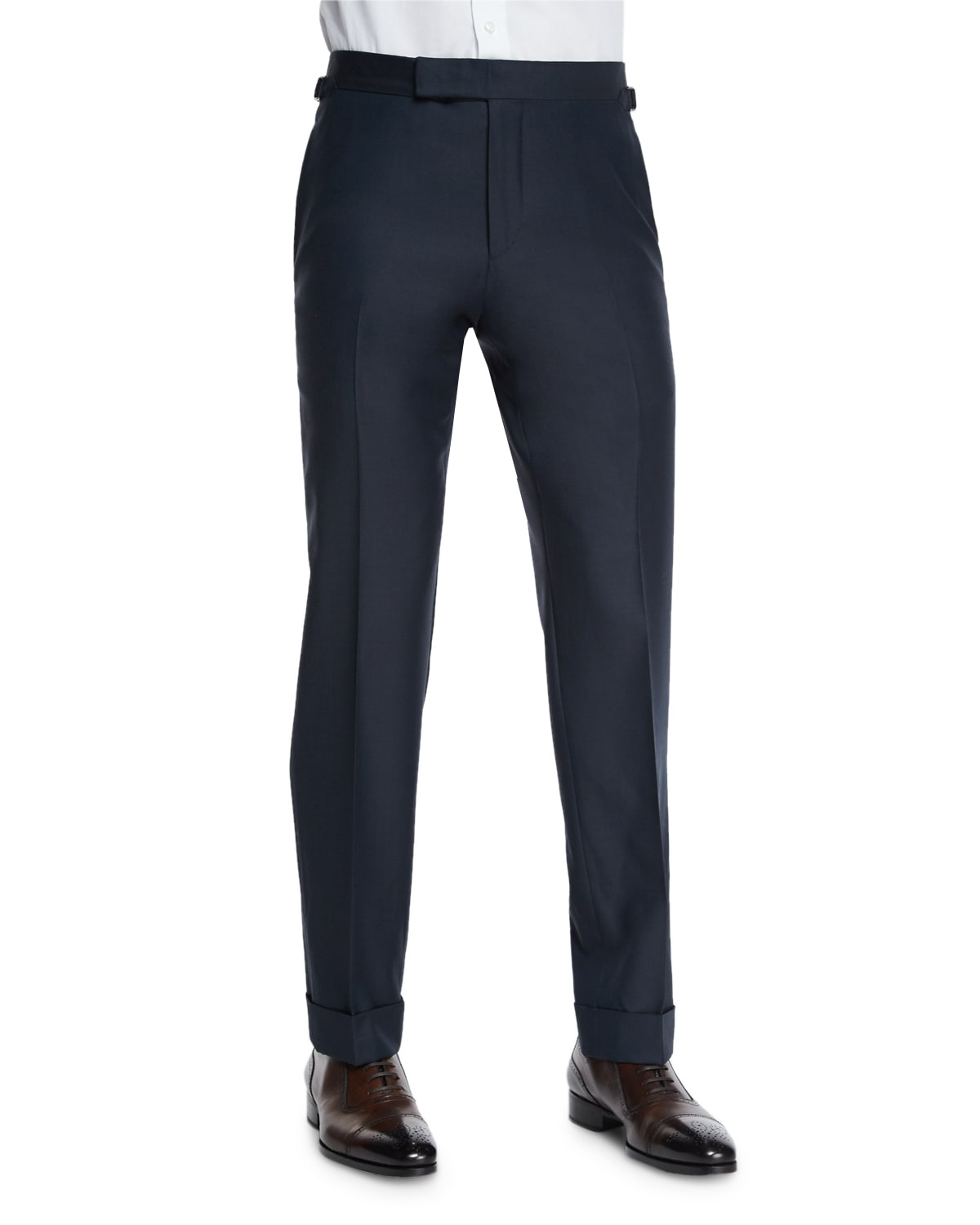 - Tom Ford "O'Connor" base sharkskin trousers. - Side pockets follow seam of pants for clean lines. - Back button-welt pockets. - Flat front. - Smooth side adjusters for perfect fit; back vent allows for greater movement. - Concealed horn button at waistband; zip fly. - Internal pleated skirt lining to keep shirt in place. - 19cm hem width. - Wool. - Imported. - Please contact your local Neiman Marcus store for proper finishing of your garment. - Model is 6'1"/185cm.