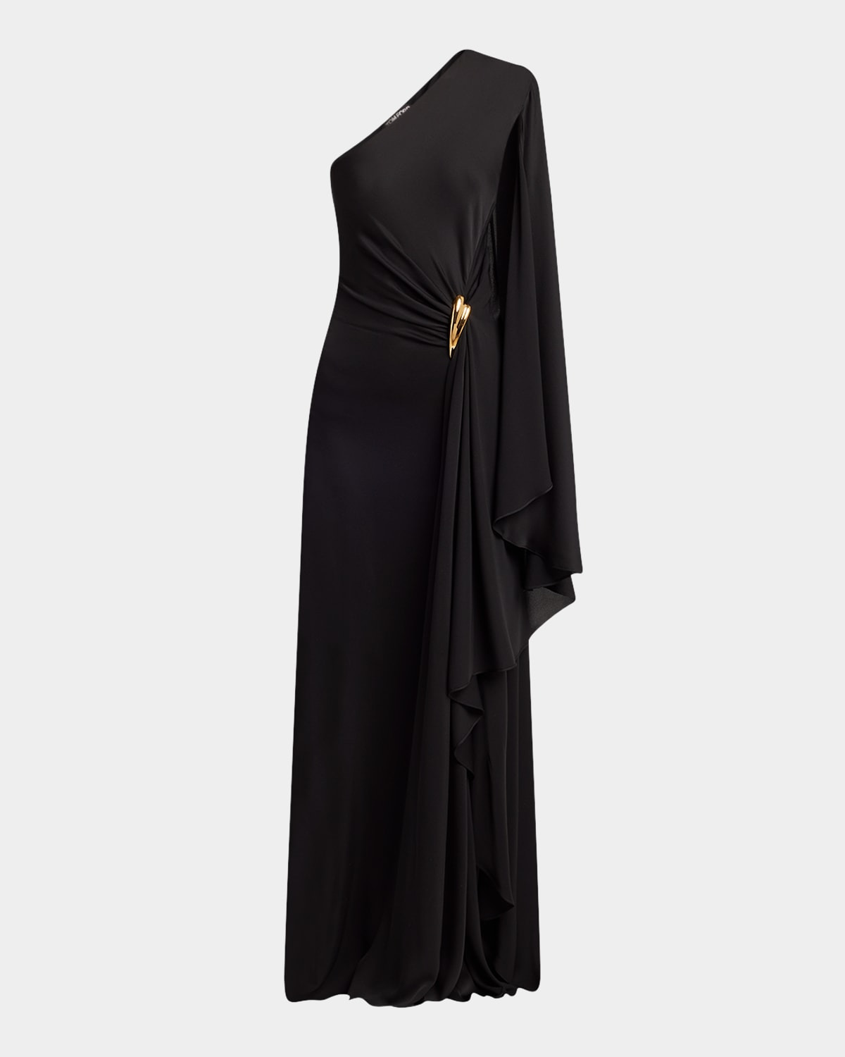 ONE SHOULDER EVENING DRESS WITH CAPE AND LIZA HARDWARE DETAIL