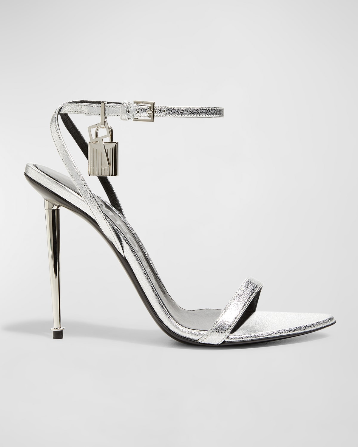 - TOM FORD sandal in metallic napa leather. - Signature hanging padlock and key charm. - 4.3" metallic stiletto heel. - Pointed open toe. - Adjustable halter ankle wrap. - Leather sole. - Made in Italy. - Size Note: Item runs large, consider ordering a size down. Heel height may vary by size.