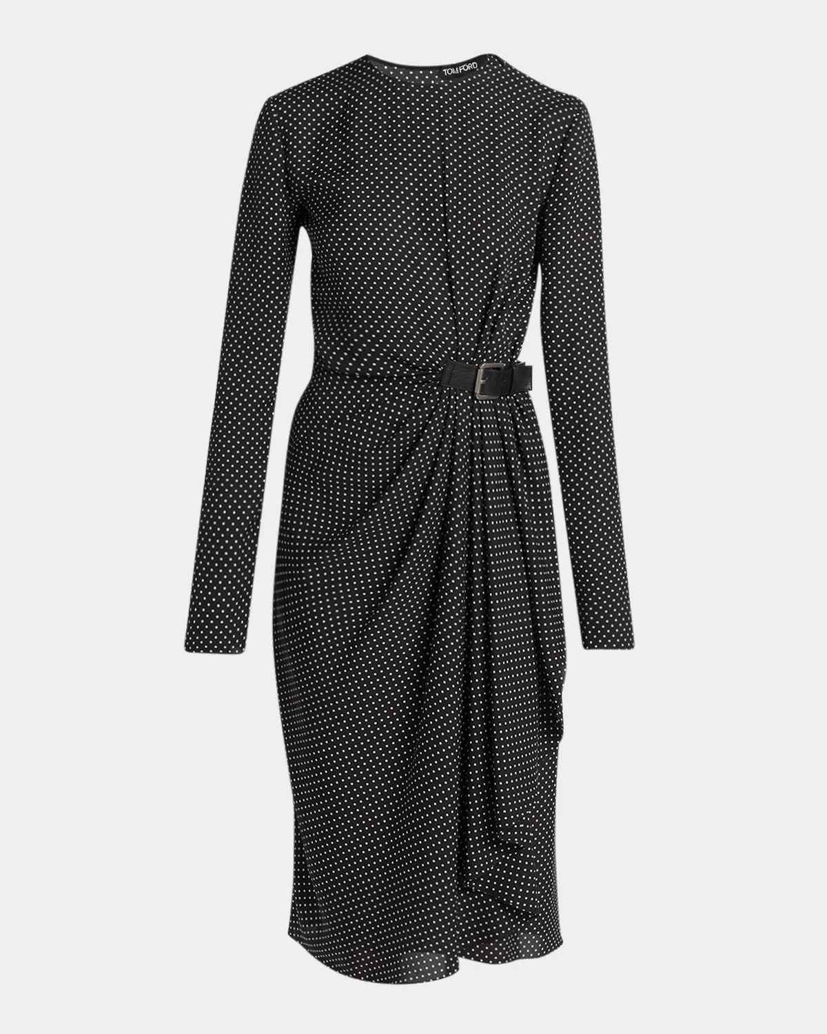 TOM FORD dress is crafted from a polkadot printed silk gathered at the waist with a lambskin leather buckle detail Round neckline; invisible shoulder zip Long sleeves Sheath silhouette Hem falls below the knee Slipover style Silk/leather Made in Italy