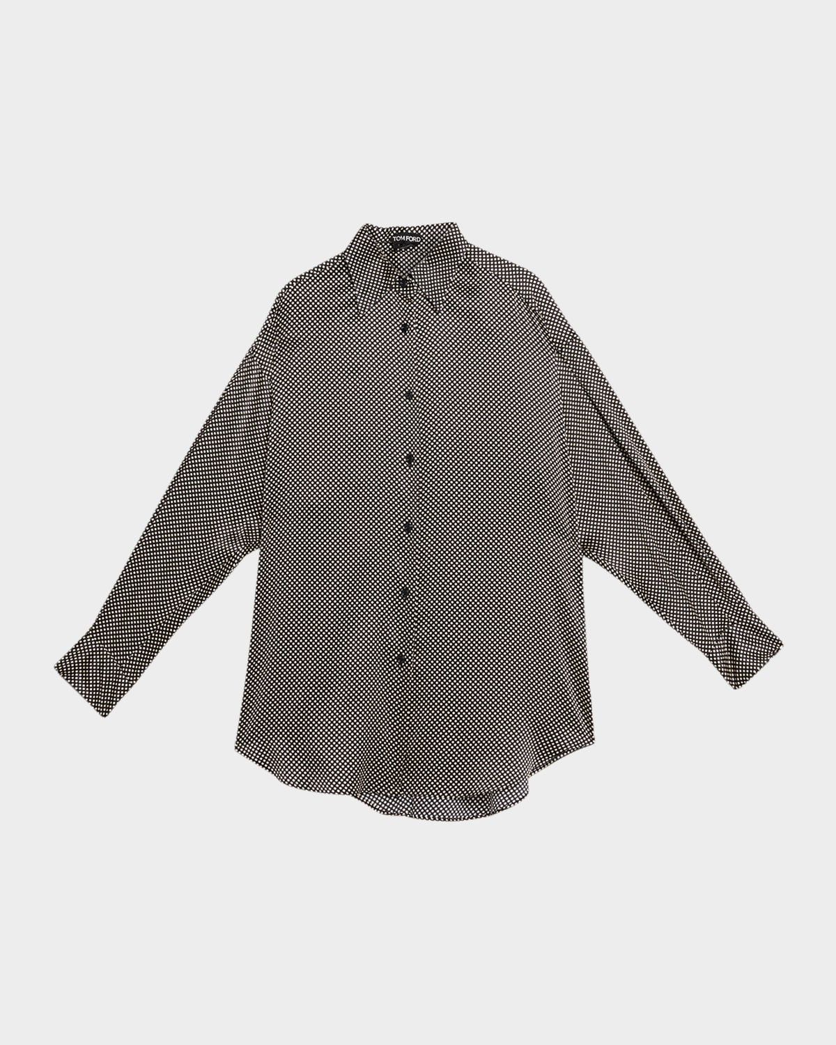 - TOM FORD shirt in polka dot printed stretch satin - Point collar; button front - Long sleeves; button cuffs - Yoked back; box pleat - Loose fit - Shirttail hem - Silk/elastane/mother-of-pearl - Made in Italy
