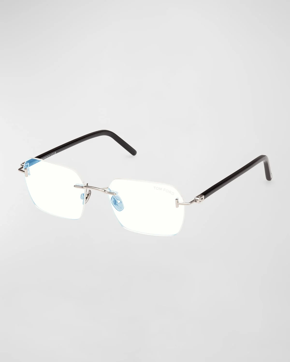 - TOM FORD "FT5934" rimless rectangle glasses in metal and acetate - Lens/bridge/temple (in mm): 54-18-145 - Adjustable nose pads - Signature T hinges - Thin, tapered arms - Ready-to-wear clear lenses enhanced by a blue coating able to reduce the risks related to blue light exposure from LED screens - Spot clean - 100% UVA/UVB protection - Made in Italy - Proposition 65 warning for California residents