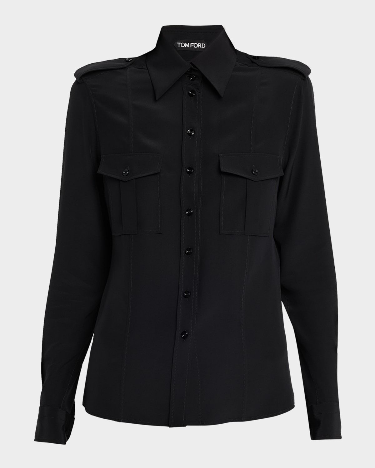 - TOM FORD military shirt in silk crepe de chine with front seaming detail - Point collar; button front - Long sleeves; button cuffs - Shoulder epaulets - Chest button-flap pockets - Relaxed fit - Shirttail hem - Silk/mother-of-pearl - Made in Italy