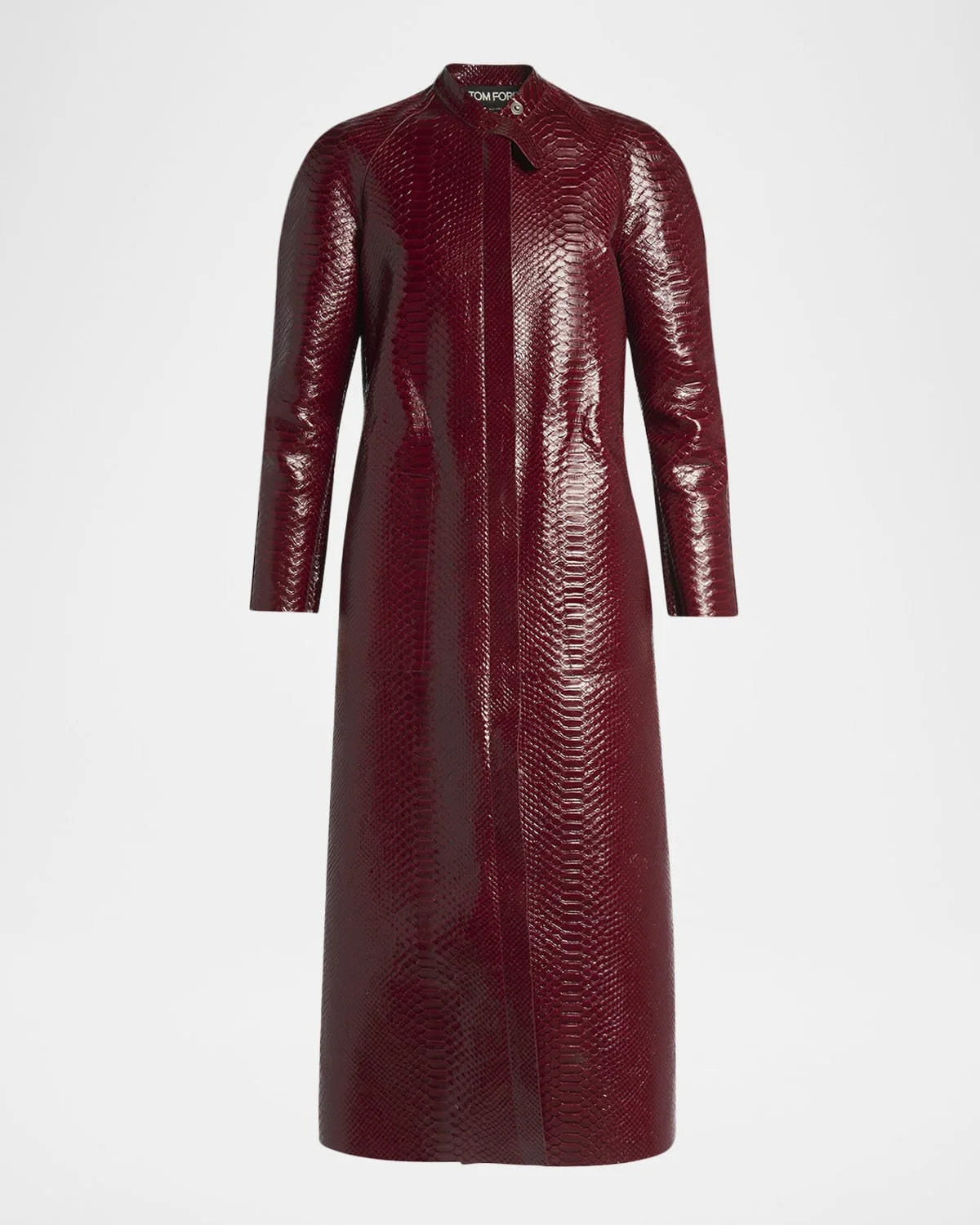 Fusing & nbsp;edge with Italian craftsmanship, this Tom Ford & nbsp;coat is rendered in snake embossed & nbsp;calfskin leather Band collar with throat latch Long raglan sleeves Side split pockets A-line silhouette Hem falls below the knee Concealed zip front Leather Lining: Silk Made in Italy