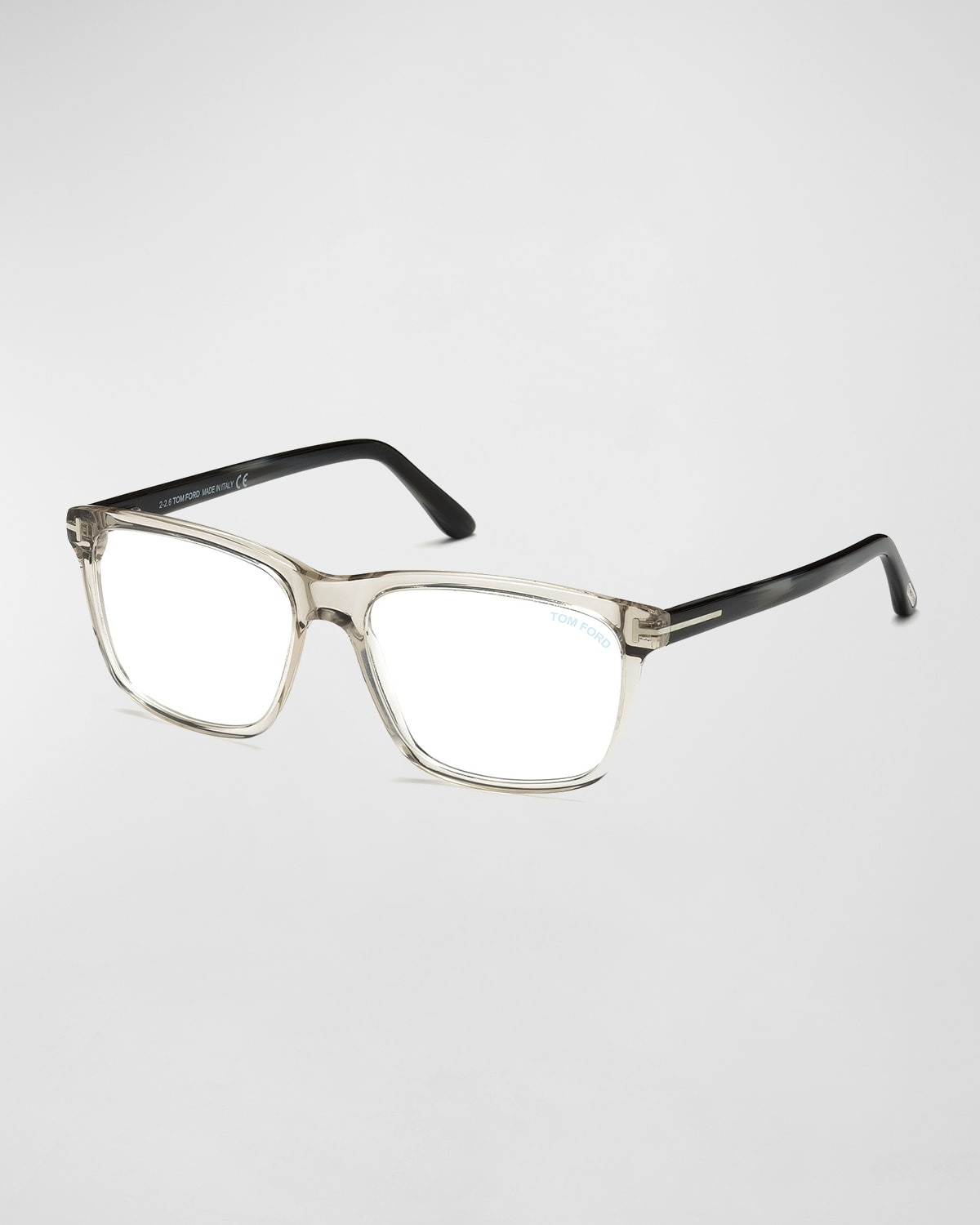 - TOM FORD square optical glasses. - Solid acetate frames. - Signature T insets at temples. - Clear, non optical demo lenses protect from blue rays emitted from electronic devices and energy efficient lighting. - 100%25 UVA/UVB protection.