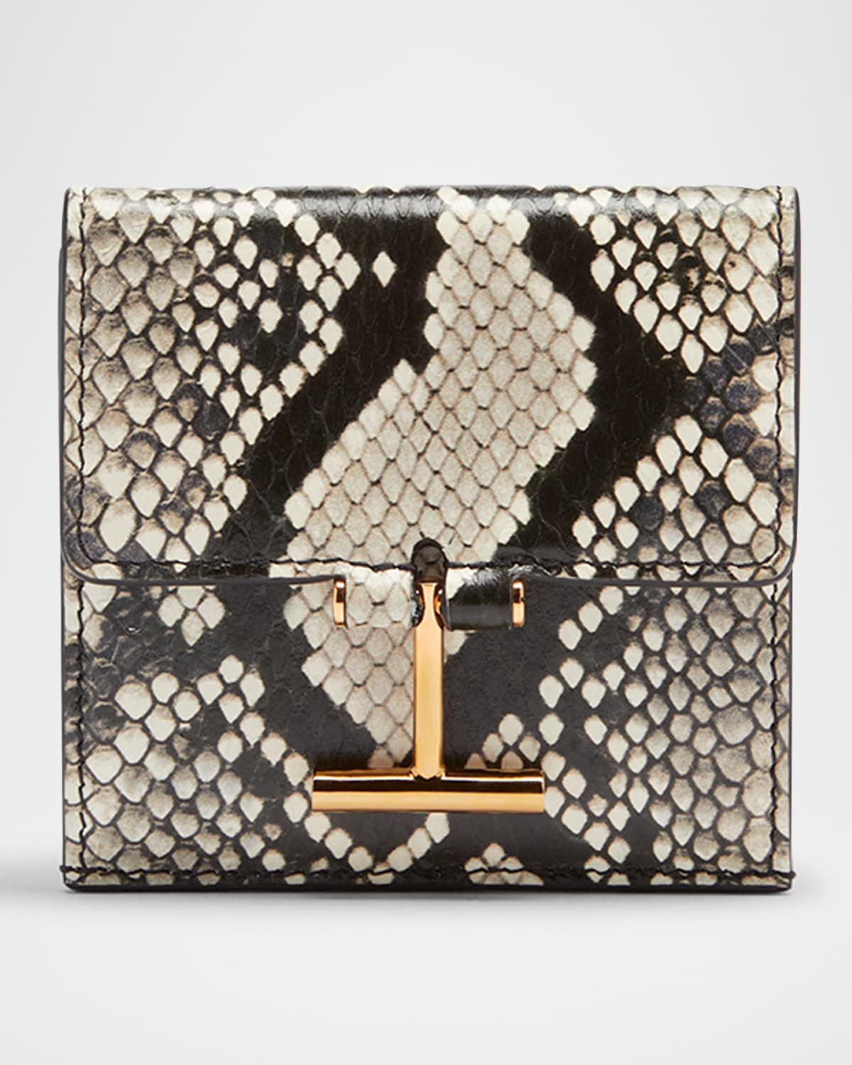 - TOM FORD card holder in python printed leather - Flap top with T bar snap closure - Exterior, four card slots - Approx. 3.7"H x 3.7"W - Made in Italy