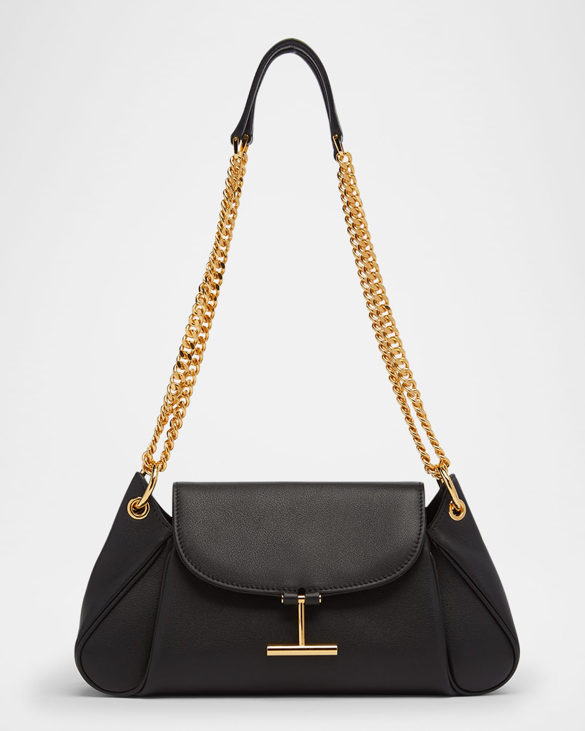 - TOM FORD "Tara" shoulder bag in grain leather and polyurethane - Sliding, adjustable chain shoulder strap - Can be worn as a shoulder or crossbody bag - Flap top with T bar magnetic closure - Divided interior; one zip pocket - Approx. 5.9"H x 11.4"W x 2.8"D - Made in Italy