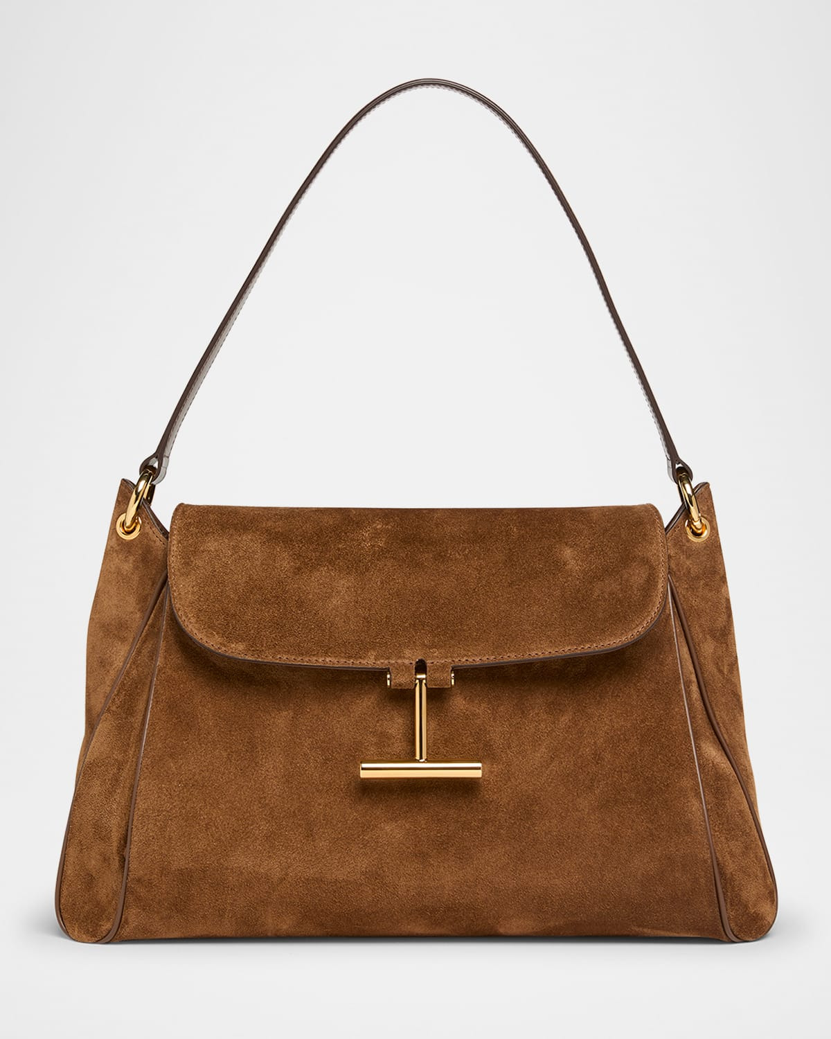 - Crafted in calfskin suede, this TOM FORD "Tara" medium shoulder bag is trimmed with smooth leather piping and features gold-tone hardware - Leather top handle - Detachable, adjustable leather shoulder strap - Can be worn as a top handle or shoulder/crossbody bag - Flap top with T magnetic strap closure - Feet protect bottom of the bag - Lining: Polyurethane - Trim: Leather - Approx. 6.3"H x 10.2"W x 3.5"D - Item Weight (Lbs.): 1.3 - Made in Italy