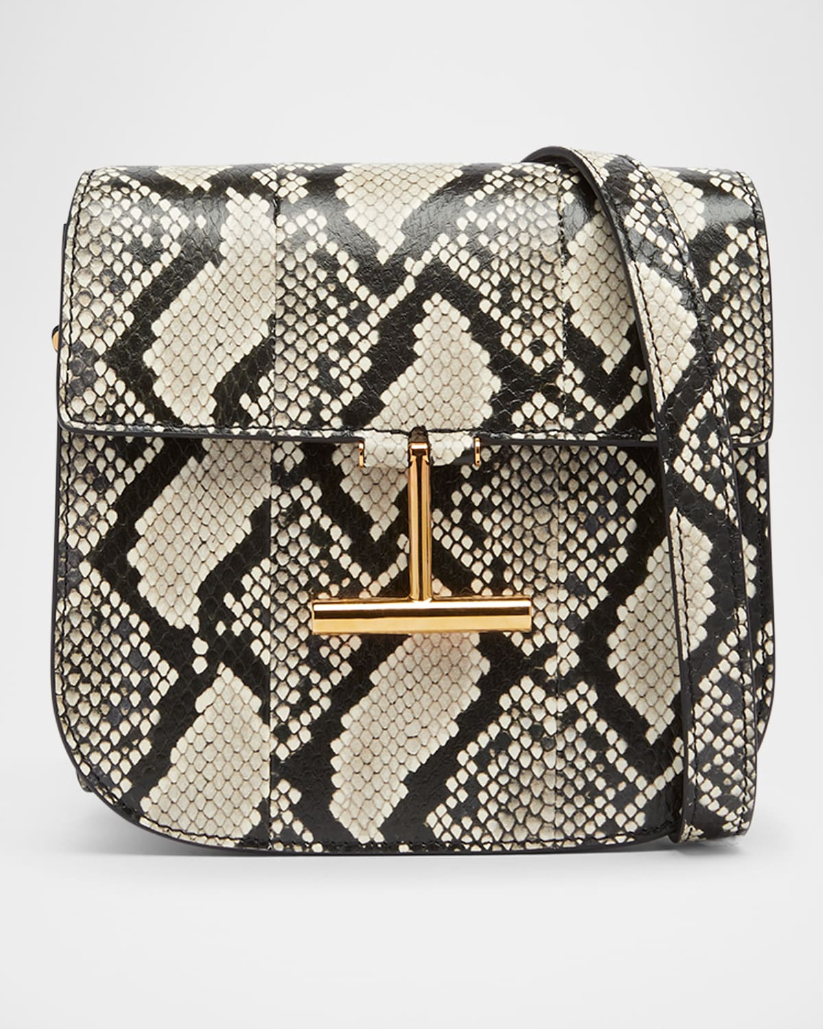 - TOM FORD "Tara" saddle crossbody bag in python-printed leather and polyurethane - Adjustable crossbody strap - Flap top with T bar magnetic closure - Exterior, back slip pocket - Interior, one zip pocket - Approx. 7.3"H x 7.9"W x 2.8"D - Made in Italy
