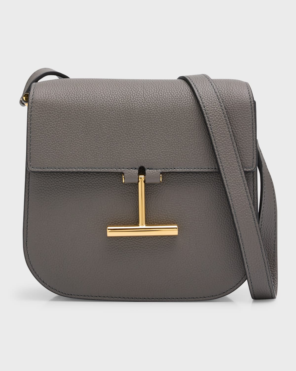 - TOM FORD grained calf leather shoulder bag. - Adjustable shoulder strap. - Flap top with metal "T" bar closure. - Inside, cotton lining; one zip pocket and one slip pocket. - Exterior, slip pocket at back. - Magnetic closure - Approx. 7.8"W x 2.7"D x 7.2"H. - Made in Italy