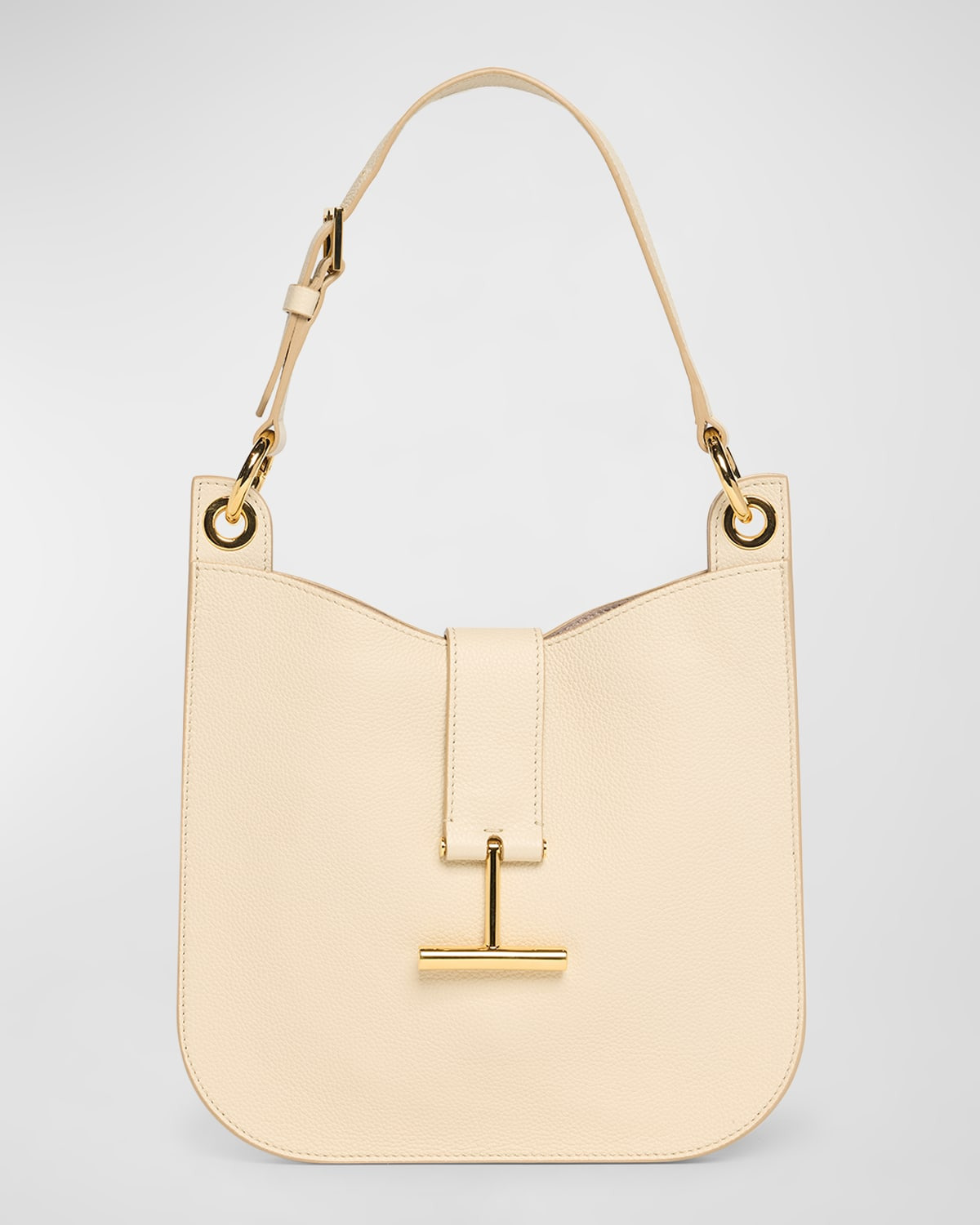 - TOM FORD "Tara" crossbody bag in grain leather, faux leather (polyurethane), and brass - Detachable, adjustable shoulder strap - Detachable, adjustable crossbody strap - Can be worn as a shoulder or crossbody bag - Open top with center T-strap magnetic closure - Interior, one zip pocket - Lining: Polyurethane - Approx. 9.8"H x 9.8"W x 0.8"D - Item Weight (Lbs.): 1.5 - Made in Italy