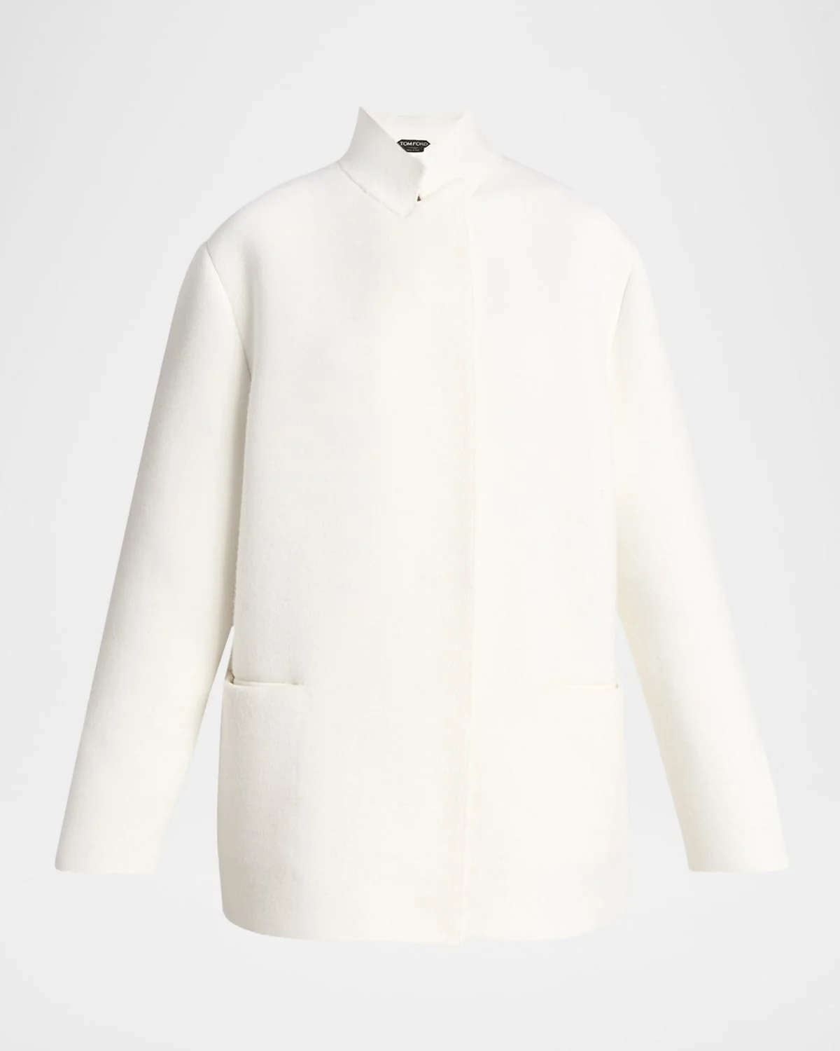 TOM FORD jacket crafted of cashmere-blend knit with a signature goldtone T-pin & nbsp; Stand collar; open front Long sleeves; unfinished cuffs Hip split pockets Loose fit Walking vent back Wool/cashmere/elastane Made in Italy