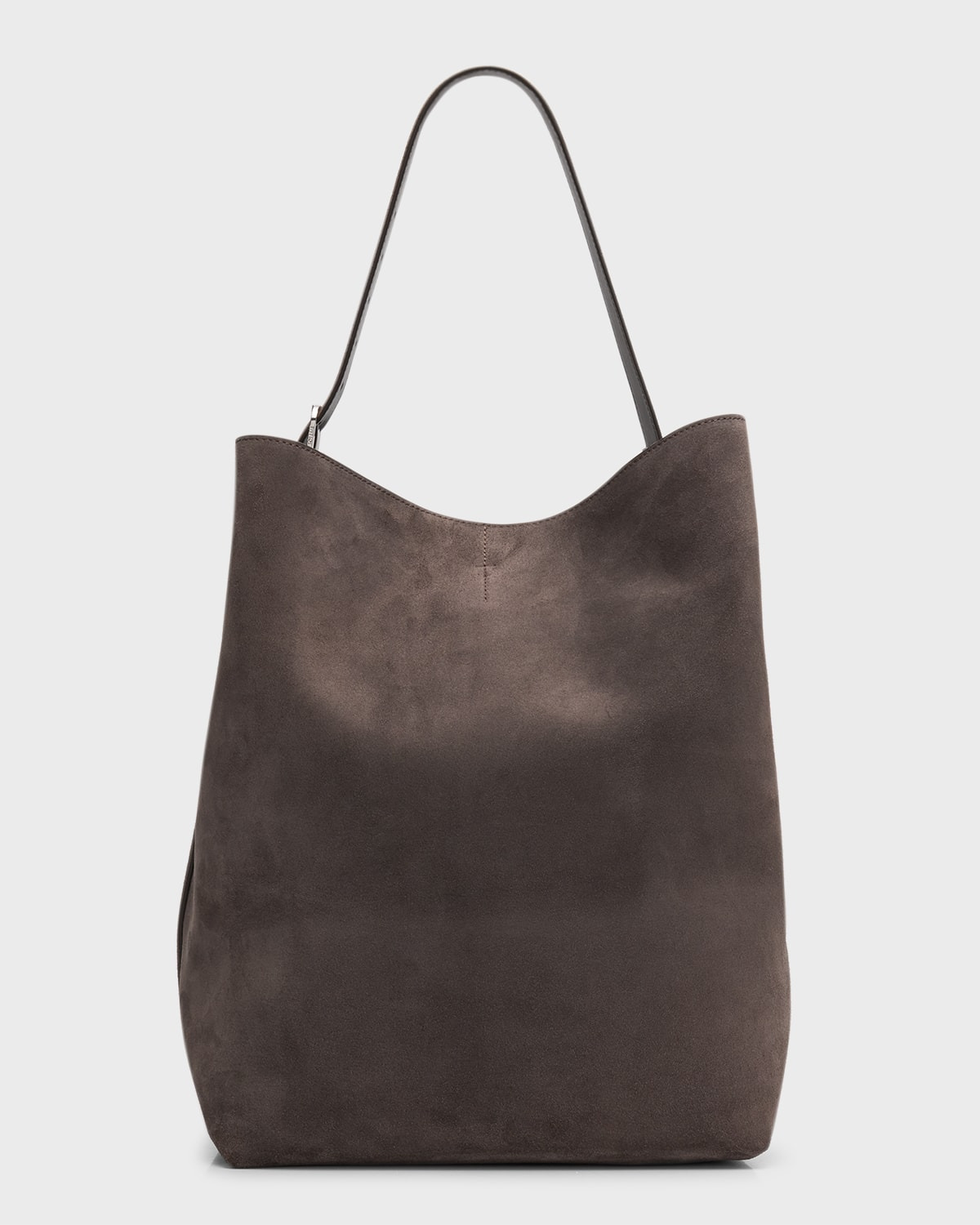 - Toteme tote bag in suede and leather - Top handle - Detachable, adjustable shoulder strap - Can be worn as a top handle or shoulder bag - Open top with lobster clasp closure - Interior, two slip pockets - Lining: Polyurethane - Approx. 14"H x 13.4"W x 10.6"D - Made in Italy