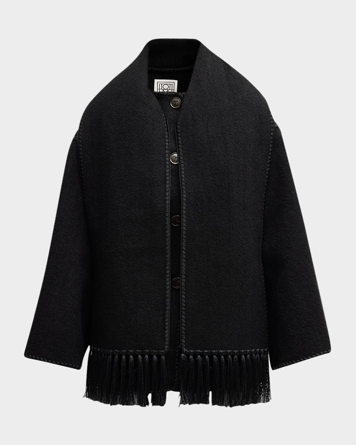 - Toteme jacket features an embroidered scarf with fringe trim - High neckline; button front - Long sleeves - Straight fit - Front pockets - Wool/polyester - Imported - Model is 5'10"/177cm. - Size Note: Item runs large, consider ordering a size down.