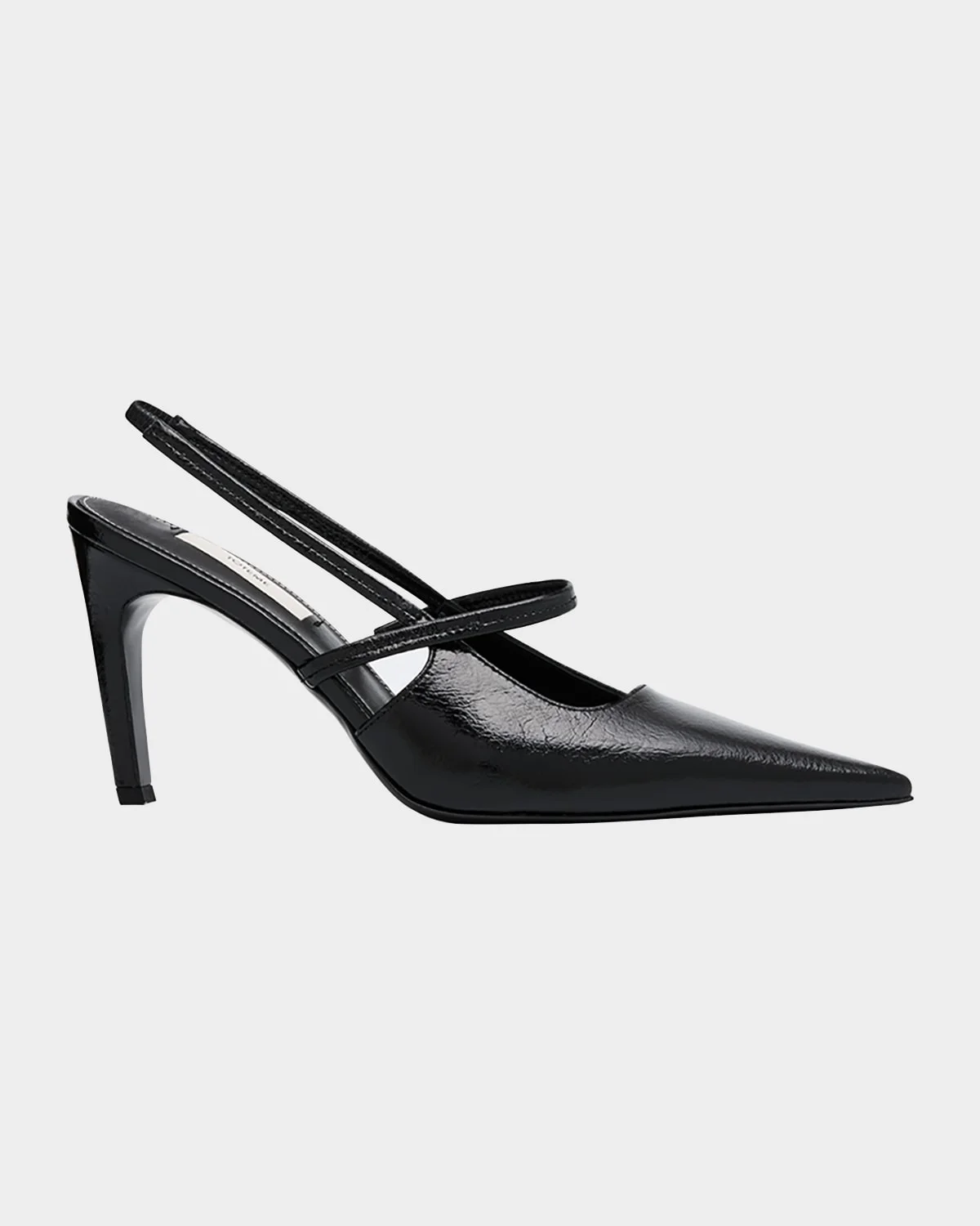 Toteme shiny crinkled leather slingback pumps reworked with a sculpted heel as an elevated take on stilettos 2.50 in / 65 mm stiletto heel Pointed toe Stretch Mary Jane strap and stretch slingback strap Slipon style Leather outsole Lining: Leather Made in Italy