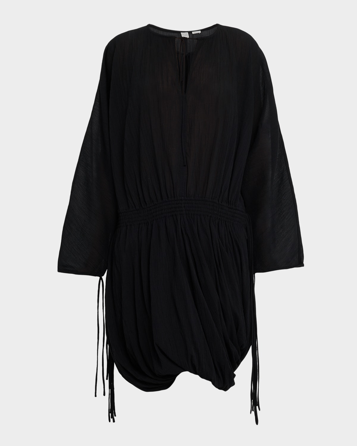 - Toteme crinkle cotton dress features a multi-drawstring cinched waist and a draped bubble hem - Round neckline; self-tie split V front - Long sleeves - Drop shoulders - Shift silhouette - Knee length - Slipover style - Cotton - Made in Italy