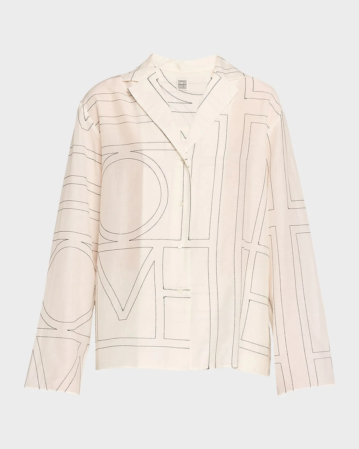 Toteme pajama-style shirt topstitched with the brand & apos;s contrasting distinctive monogram & nbsp; Notched collar; mother-of-pearl button front Long sleeves Yoked back Hip length Relaxed fit & nbsp; Organic cotton/lyocell Imported