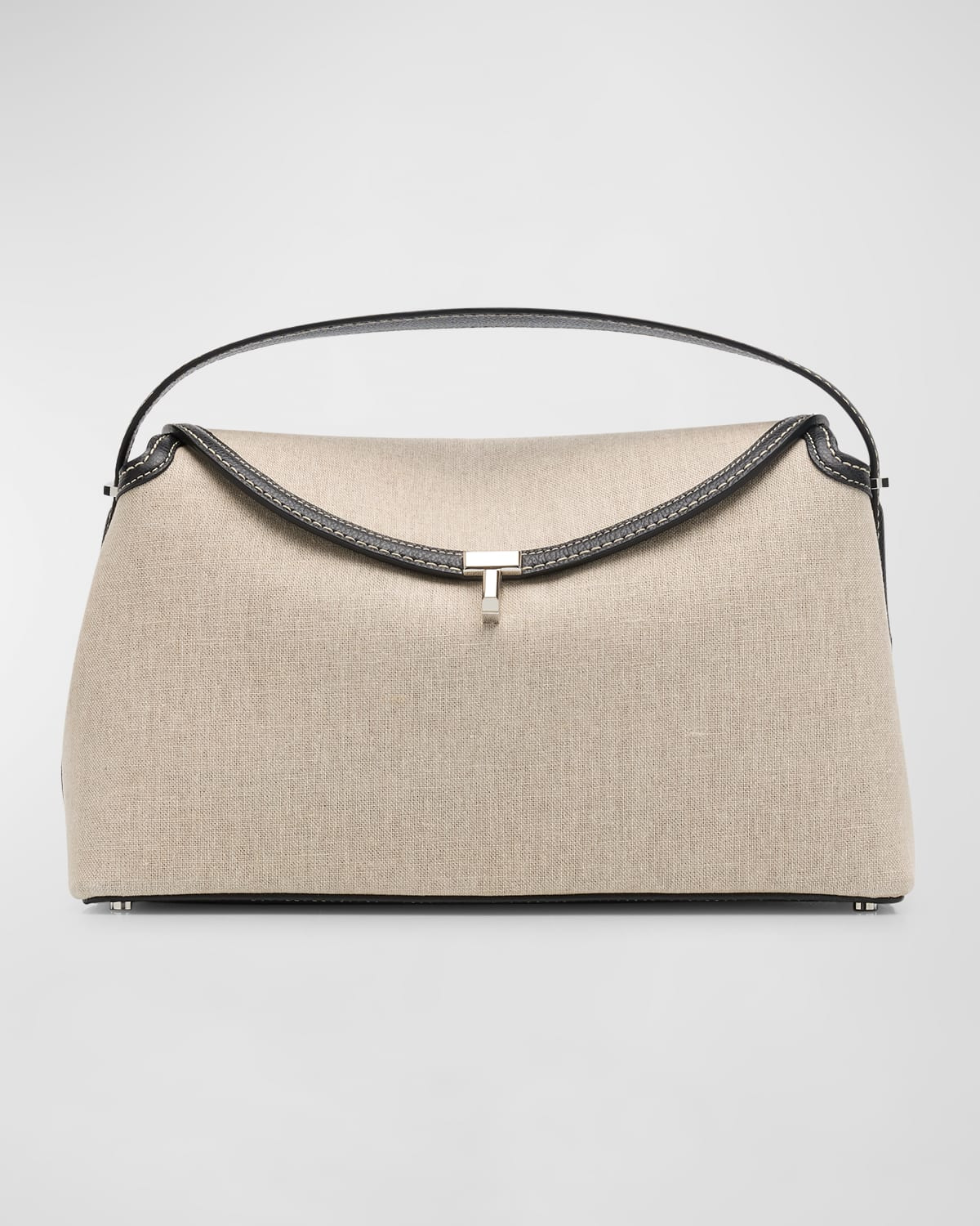 - Toteme top handle bag in organic cotton and linen - Top handle - Detachable crossbody strap, 17.8" drop - Can be worn as a top handle or crossbody bag - Fold-over flap top with T-lock closure - Interior, two slip pockets - Feet protect bottom of bag - Approx. 6.7"H x 13.7"W x 4.5"D - Made in Italy