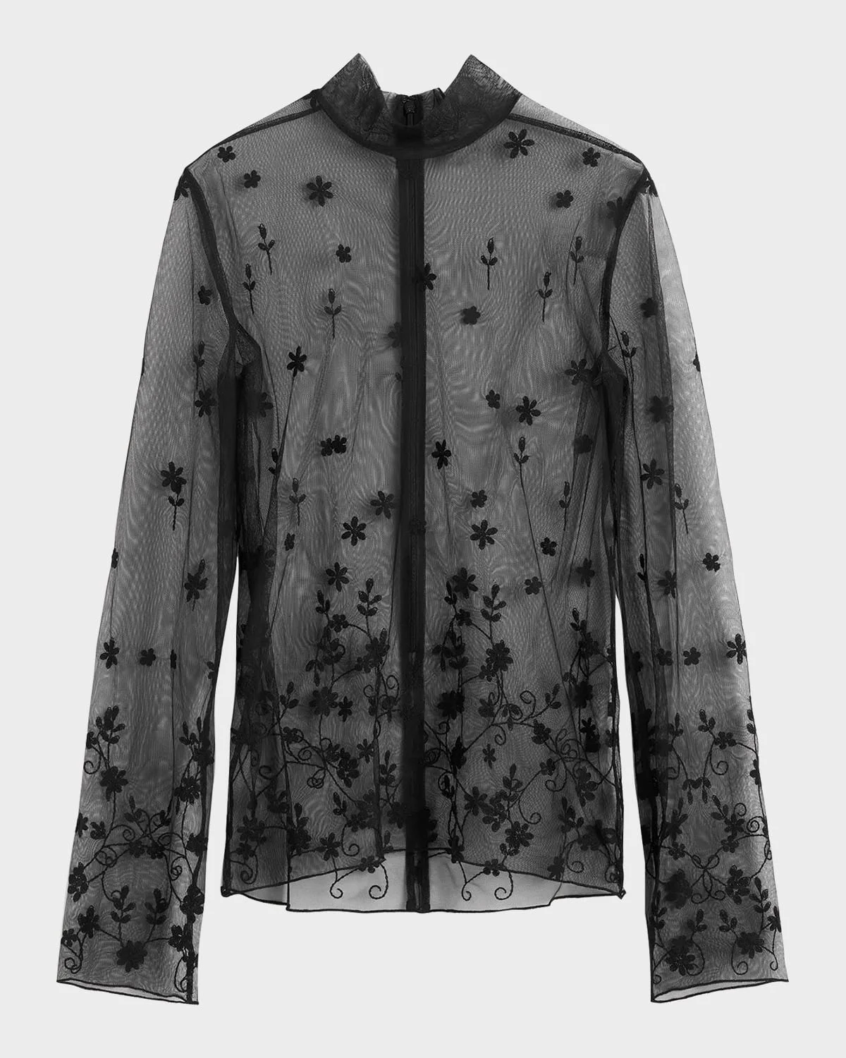 Turtleneck Floral Tulle Long-Sleeve Blouse