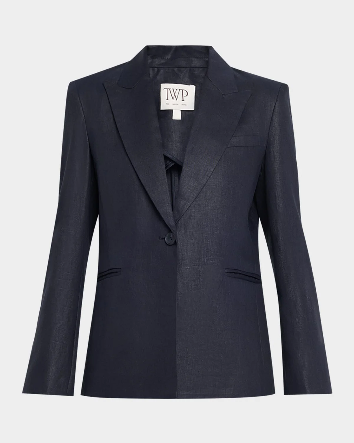 TWP & apos;s "Boy" blazer is realized in a classic, compact linen with a chintzed finish for structure and a subtle, luxe sheen Peak lapels; single-button front Custom-molded shoulder pads Long sleeves; button cuffs Chest welt pocket Side pockets Vented back hem Oversized fit Linen Dry clean Made in USA SIZE & FITModel measurements: 5 & apos;10" tallModel is wearing a US size 4/Small