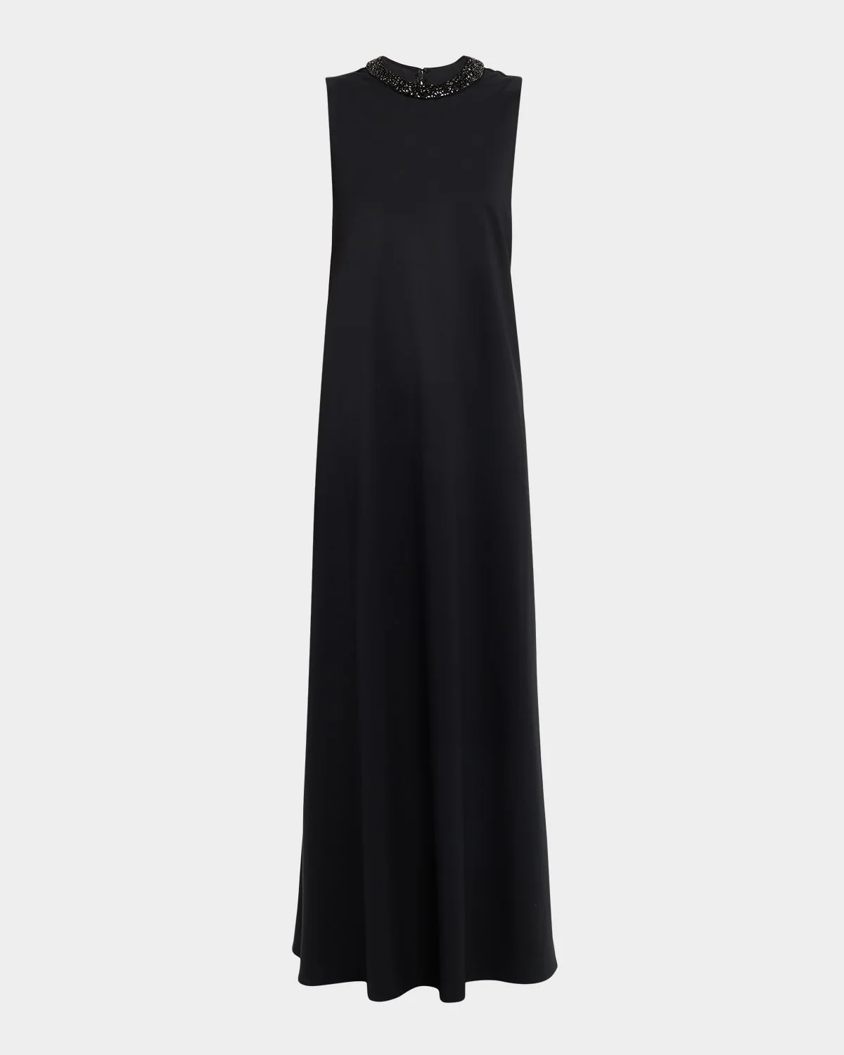 The "Capitol" floorlength gown by TWP is crafted from twill in a silk finish with a crystalembellished collar Approx. 60.3"L from shoulder to hem Crew neckline Sleeveless Side seam pockets Full length Aline silhouette Back keyhole/button closure Viscose/wool/elastane Lining: Silk/elastane Dry clean Made in USA