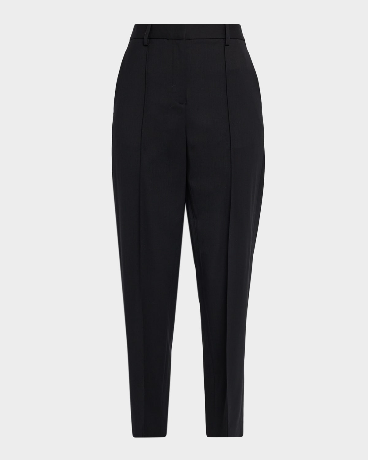 Crafted from tuxedo wool suiting with a hint of stretch, the "Harrison" trousers by TWP feature a flattering, tailored fit with legelongating front creases Approx. 11" rise; 29" inseam High rise Side slip pockets Single back welt pocket Full length Slim, straight legs Hidden hook/zip fly; belt loops Wool/elastane Made in USA