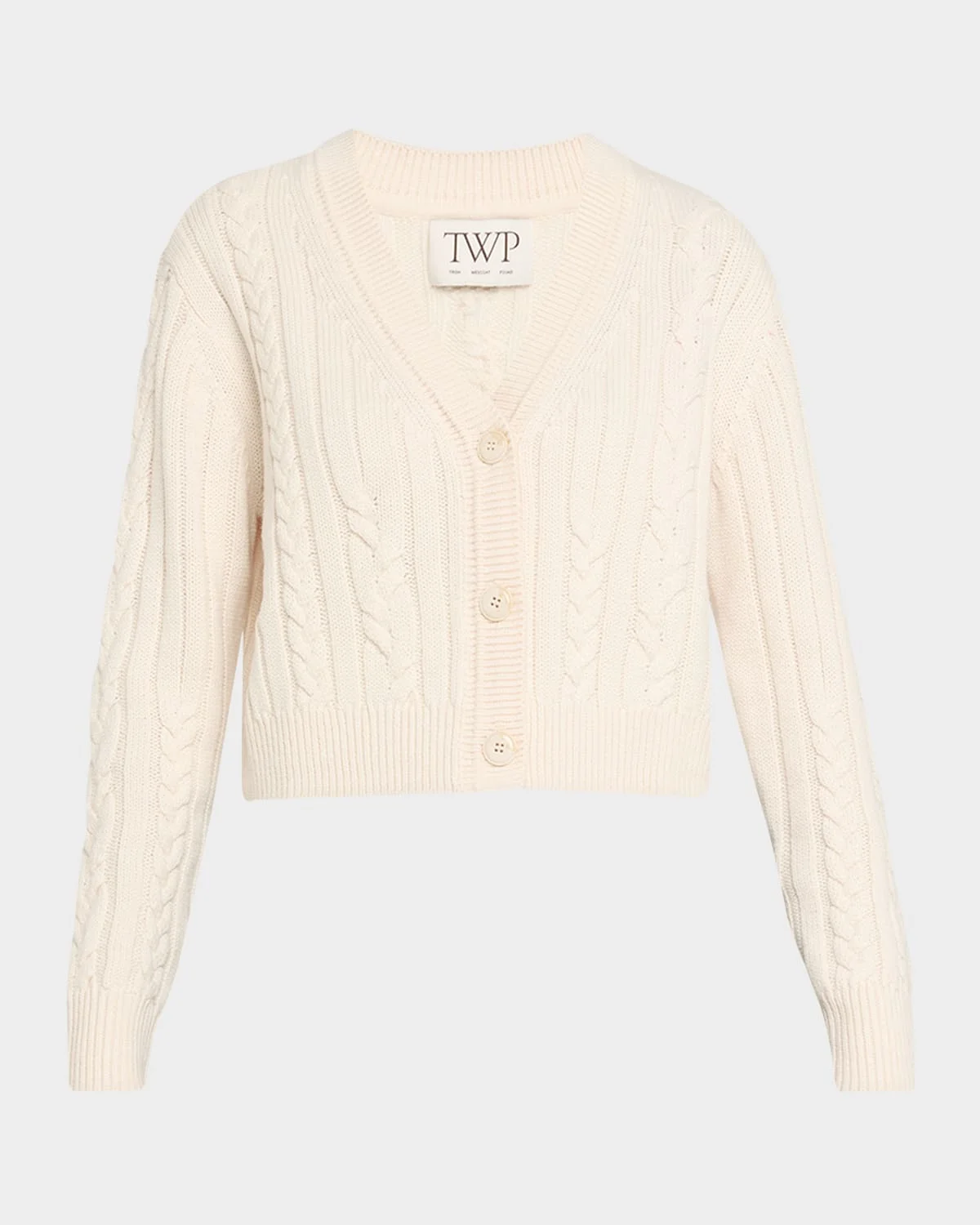 TWP "Hemingway" cardigan is crafted from a virgin wool cable knit V neckline; button front Long sleeves Relaxed fit Hip length Ribbed cuffs and hem Virgin wool Made in USA from imported materials