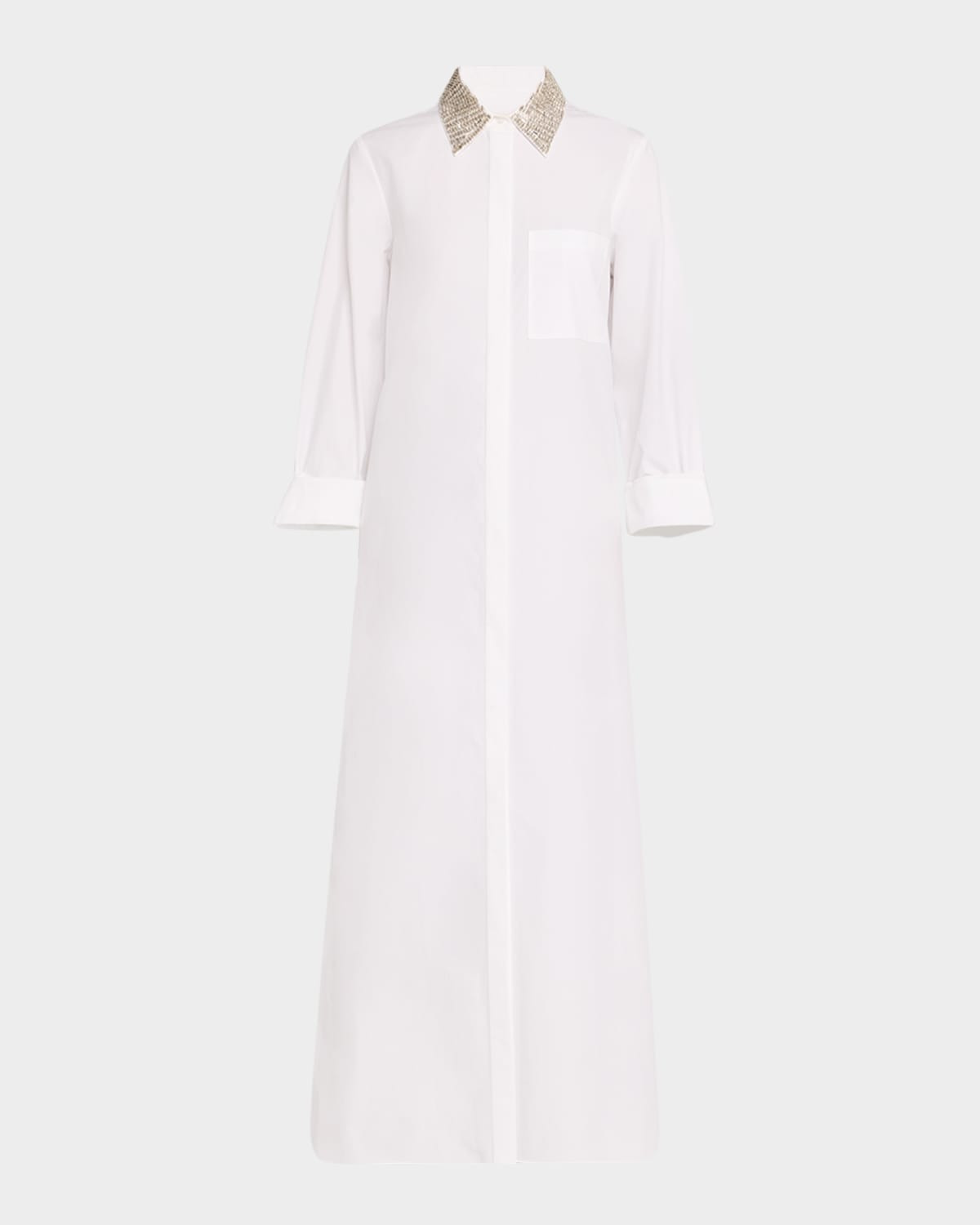 - TWP "Jennys" poplin shirtdress elevated with a crystal-embellished collar - Spread collar; concealed button front - Long sleeves; single-roll button cuffs - Single chest patch pocket - Side seam pockets - Box-pleated back yoke - Full length - A-line silhouette - Cotton - Made in USA from imported materials