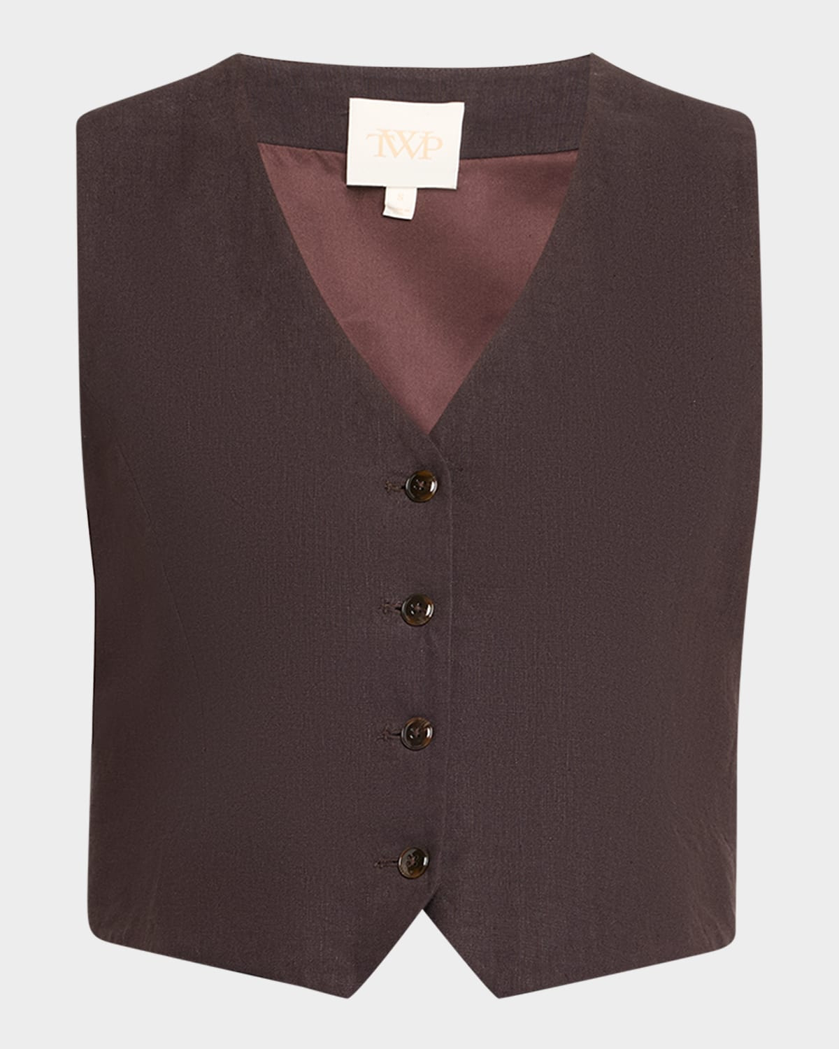 - TWP "Kikis" vest crafted from pure linen - Approx. 17.5"L from shoulder to hem - V neckline - Sleeveless - Hip length - Classic fit - Button front closure - Linen - Dry clean - Made in USA from imported materials