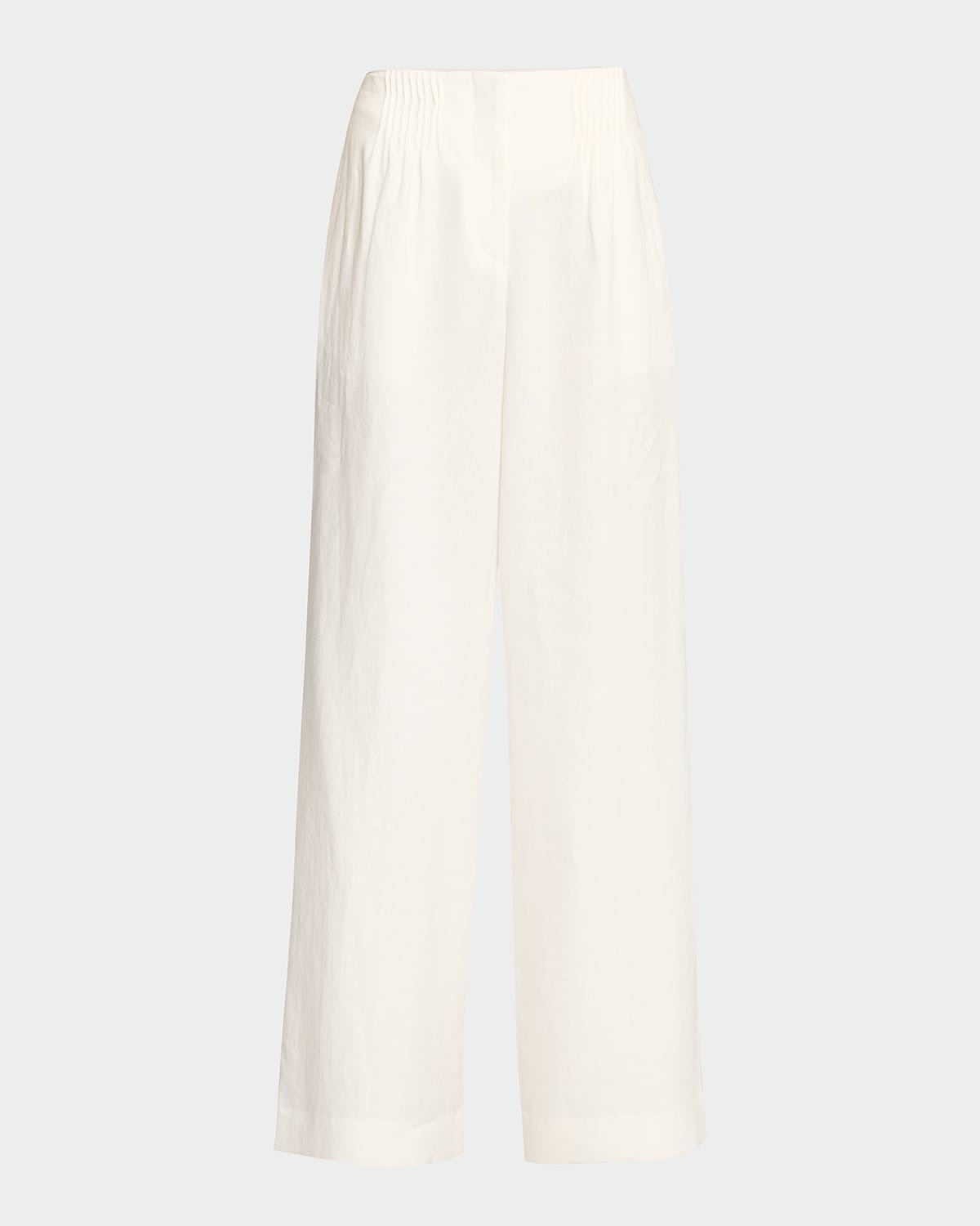 - TWP trousers accented with textural mini pleating through the front - Approx. 33.3" inseam - High rise - Side seam pockets - Back besom pocket - Full length - Straight legs - Hidden hook/zip fly - Linen - Dry clean - Made in USA from imported materials