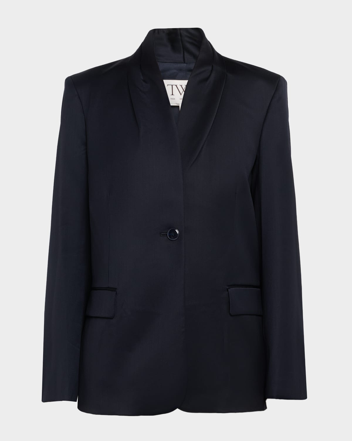 - TWP blazer constructed with a unique gathered collarless neckline - Approx. 28.5"L from shoulder to hem - V neckline - Padded shoulders - Long sleeves; button cuffs - Hip flap pockets - Center-cut back vent - Mid-length - Single-button front - Virgin wool - Dry clean - Made in USA from imported materials