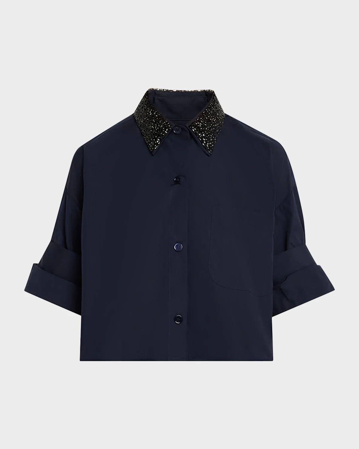 TWP "Next Ex" shirt features & nbsp;versatile sleeves that can be worn full-length or elbow-length Crystal-embellished point collar; button placket Long & nbsp;sleeves; button cuffs Dropped shoulders Yoked back Chest patch pocket Boxy fit Cropped length Cotton Dry clean Made in USA