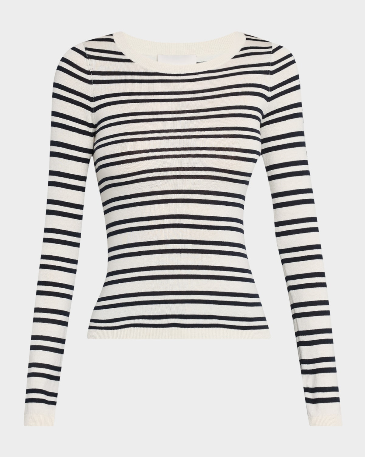 - TWP full-fashioned striped knit top in a ribbed finish - Approx. 23.3"L from shoulder to hem - Crew neckline - Long sleeves - Second-skin fit - Hip length - Pullover style - Mulberry silk/cotton - Dry clean - Made in USA from imported materials