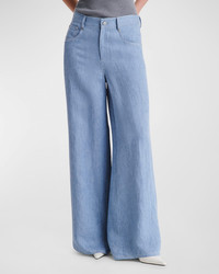 TWP "Tiny Dancer" light wash denim jeans with contrast stitching Approx. measurements: 32.8" inseam; 42.63" outseam Mid rise Fivepocket style Relaxed through hips Full length Wide legs Button/zip fly; belt loops Cotton Made in USA from imported materials