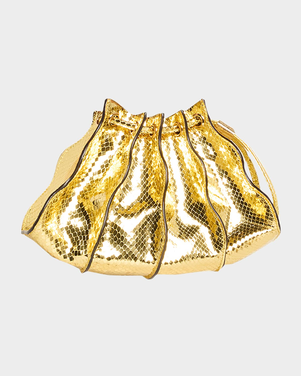 - Ulla Johnson "Adria" pleated wave pattern crossbody bag in metallic snake-print leather - Detachable crossbody strap - Can be worn as a crossbody, wristlet, or clutch bag - Drawstring closure - Lining: Suede - Approx. 6"H x 9.5"W x 2.8"D - Made in Bulgaria
