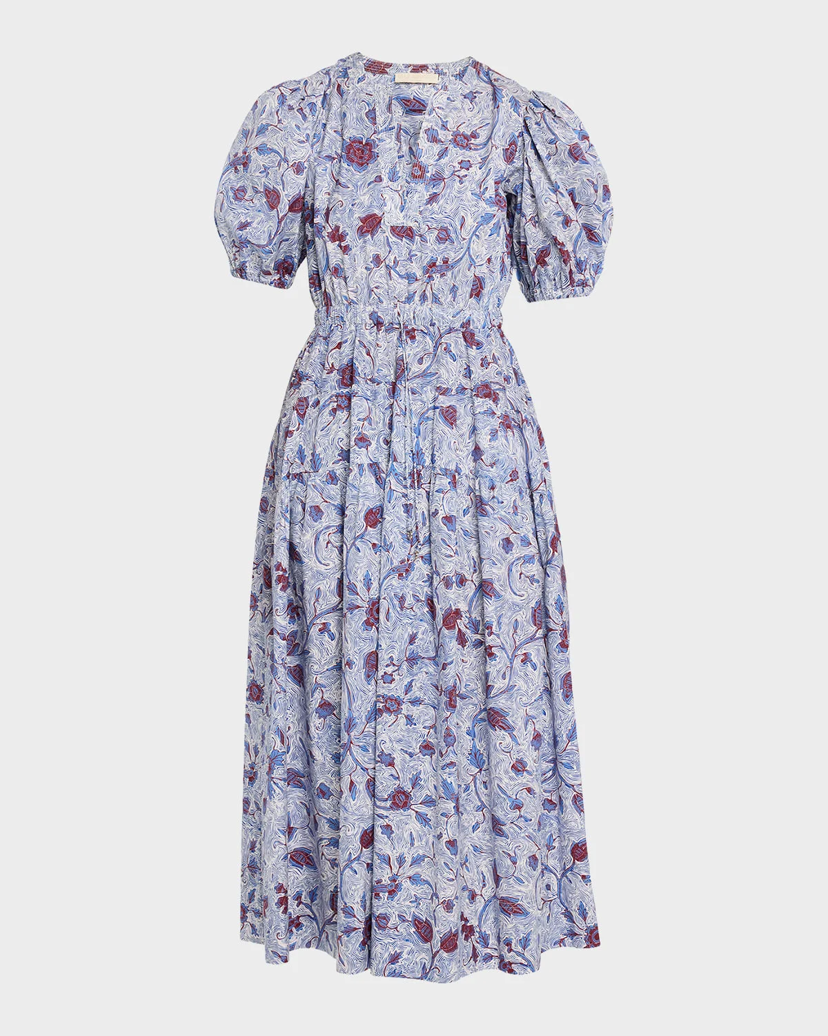 Designed with a vibrant abstract print, the "Adriana" midi dress by Ulla Johnson is crafted from crisp cotton and boasts a comfortable & nbsp;silhouette, perfect for spring to summer styling. V neckline Short puff sleeves with elasticized tie cuffs & nbsp; Drawstring waist & nbsp; A-line silhouette Hem falls below the knee Slipover style & nbsp; Cotton Dry clean or machine wash & nbsp; Imported SIZE & FITModel measurements: 5 & apos;10" tallModel is wearing a US size 4/Small