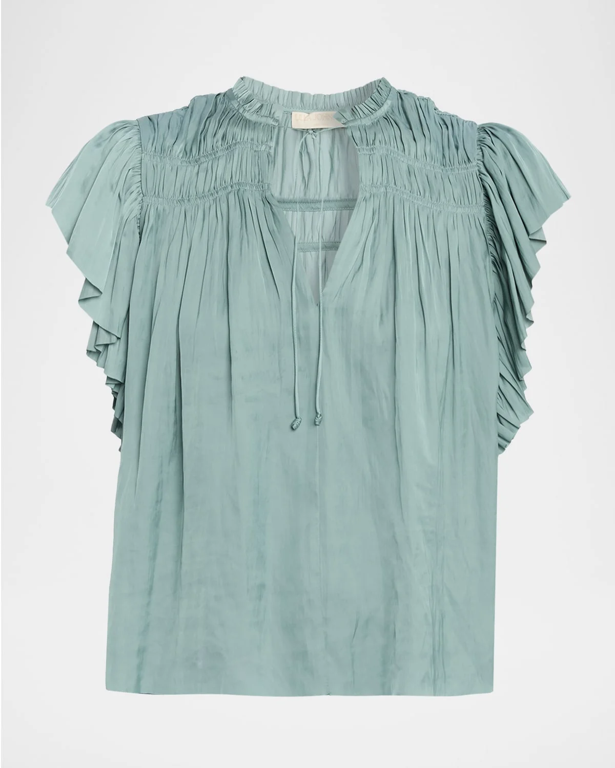 Ulla Johnson "Agosta" blouse adorned with delicate pleating and flutter sleeves V neckline with selftie Classic fit Hem falls to the hip Pullover style Polyester Imported