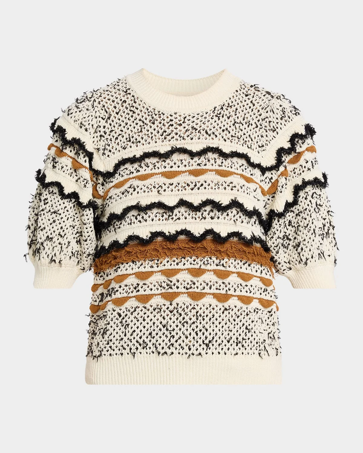 Ulla Johnson "Andira" sweater detailed with textural stripes & nbsp; Crew neckline & nbsp; Short sleeves Classic fit Hem sits at the hip Pullover style & nbsp; Polyester/cotton/linen Dry clean Imported