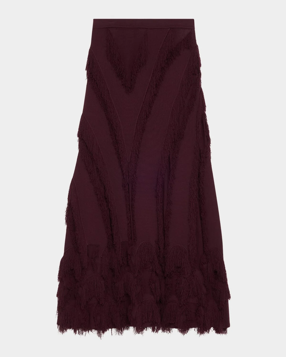 - Ulla Johnson "Astrid" skirt detailed with a sheer V'd panel and bedecked with fringe - High rise - Full length - Straight silhouette - Viscose/nylon/polyamide - Dry clean - Imported