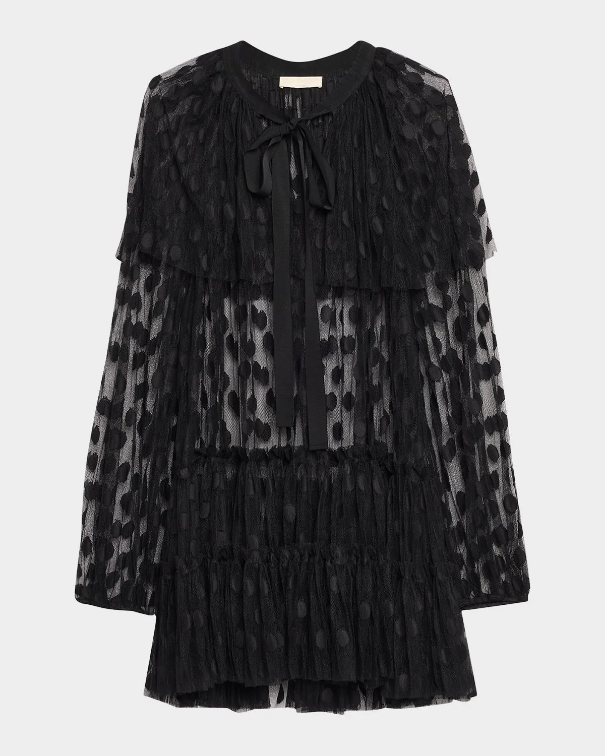 Ulla Johnson "Audette" sheer polka dot lace mini dress elevated with a selftie V neckline Long sleeves with elastic cuffs Tiered silhouette Hem falls above the knee Slipover style Nylon/polyamide/cotton Imported