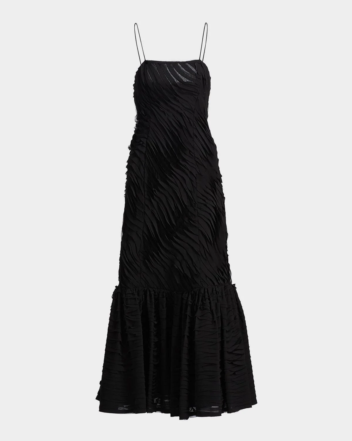 The "Augustina" dress from & nbsp;Ulla Johnson features a pleated, wave-textured finish and a voluminous flounced hem & nbsp; Square neckline Fixed spaghetti straps Ruffled flounce & nbsp;hem Trumpet silhouette Concealed side zip closure Polyester Imported