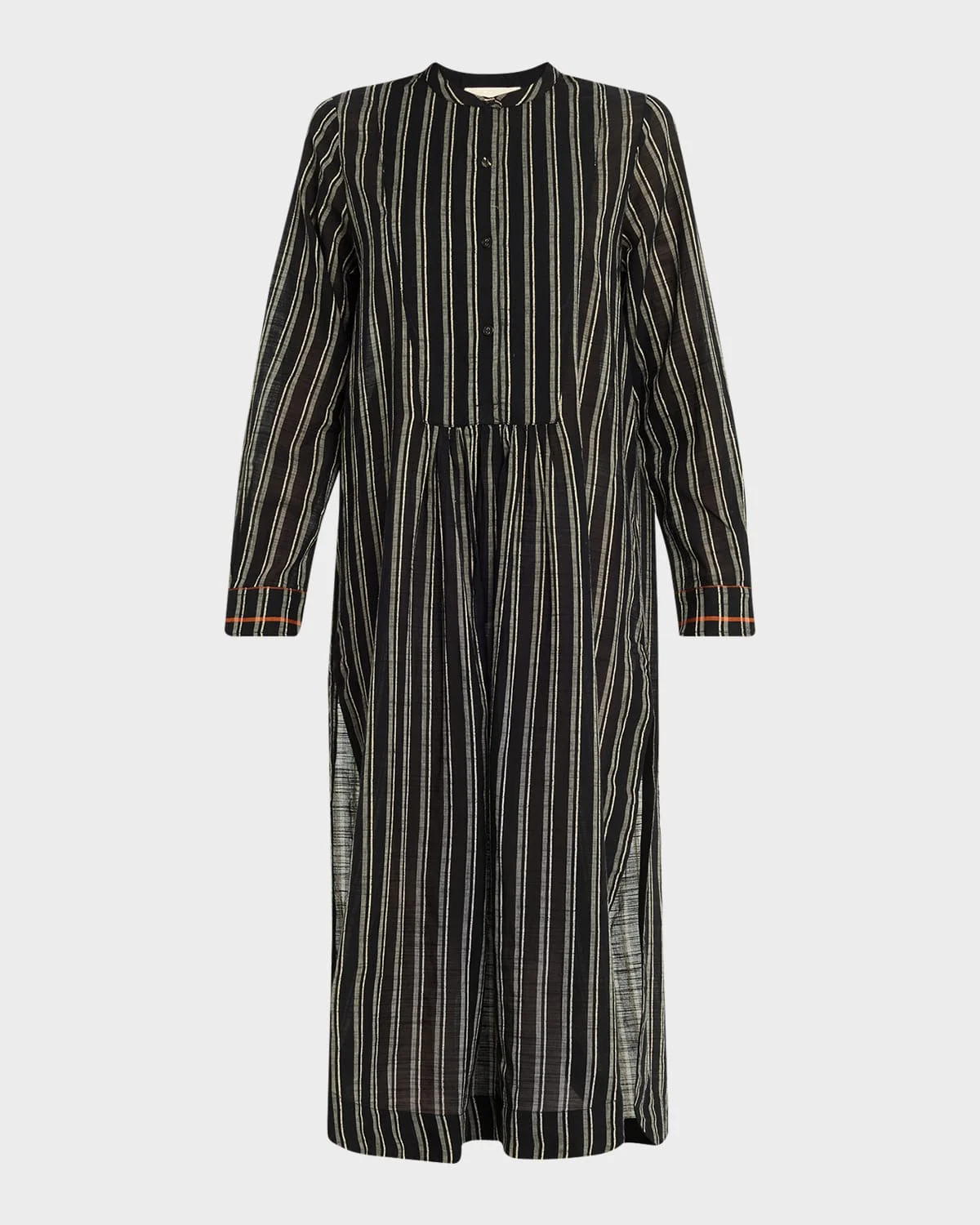Ulla Johnson's "Brita" coverup is meticulously hand-loomed from airy cotton, featuring a prismatic vertical stripe motif in a relaxed, tunic-style silhouette Band collar; partial button front Long sleeves; button cuffs Yoked back Thigh-high side slits Hem falls below the knee Slipover style Cotton Made in Italy SIZE & FITModel measurements: 5 & apos;10" tallModel is wearing a US size 4/Small