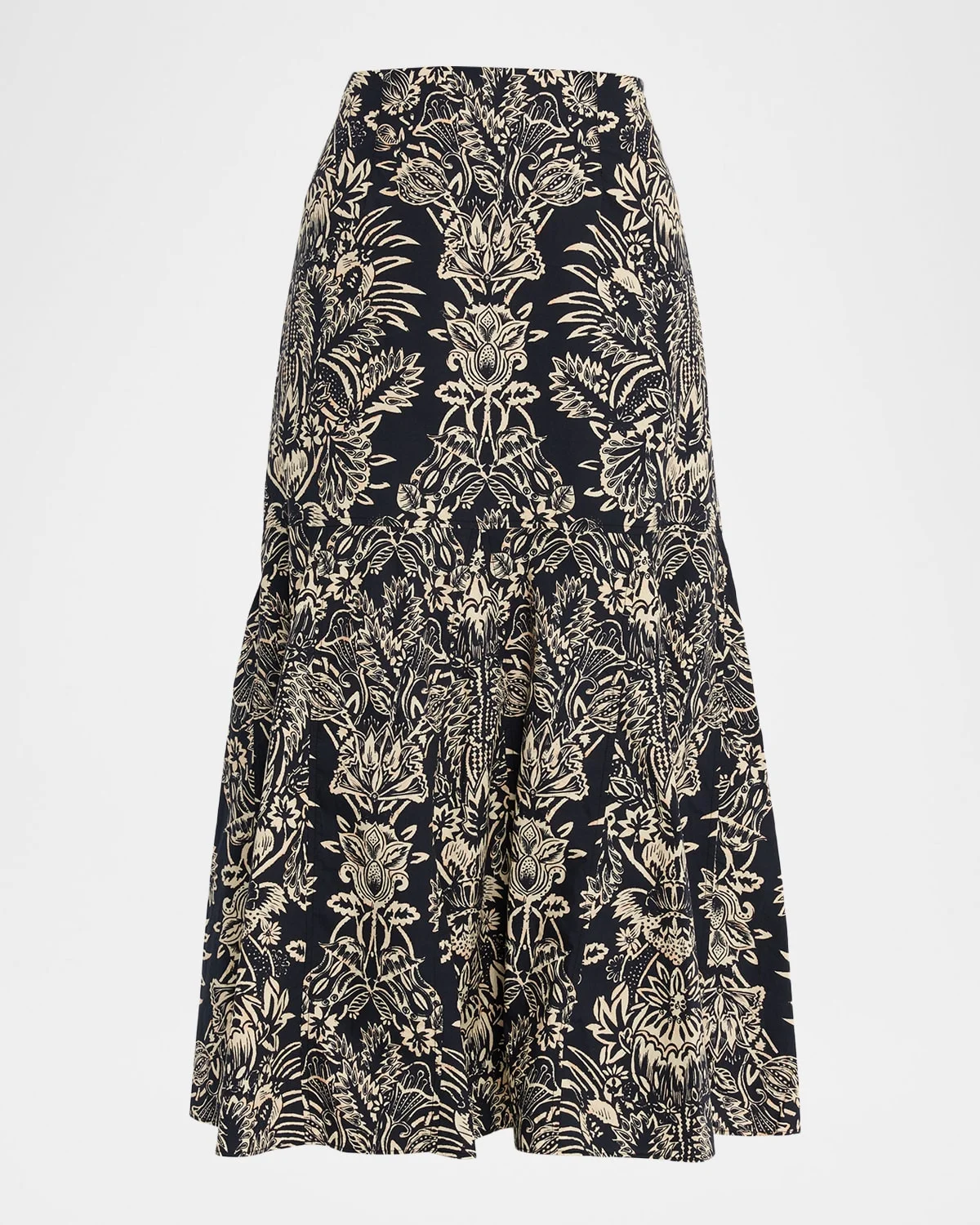 Ulla Johnson "Clarissa" maxi skirt decorated in an intricate print High rise Dropwaist silhouette Full length Zip closure Cotton Imported