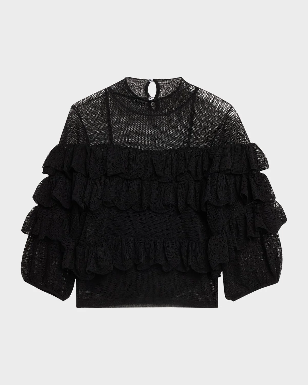 Designed in a point d'esprit and chantilly lace knit, the "Corinna" top by Ulla Johnson boasts cascading tiers that define the silhouette and a feminine touch. Mock neckline Elbow-length sleeves with elastic cuffs Slim fit Hem sits at the hip Pullover style & nbsp; Viscose/nylon/polyamide Dry clean & nbsp; Made in Italy SIZE & FITModel measurements: 5 & apos;10" tallModel is wearing a US size 4/Small