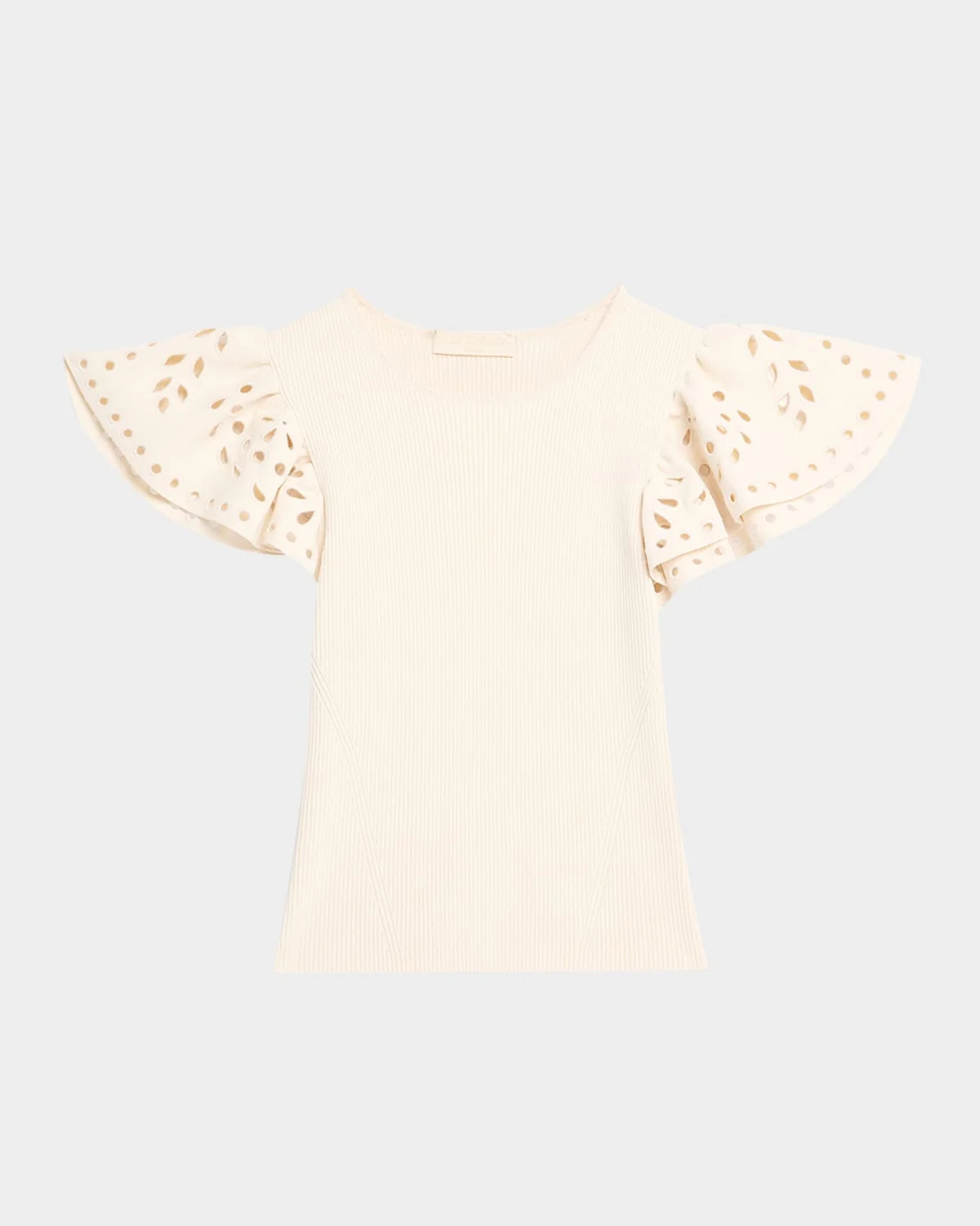 - Ulla Johnson "Edith" rib-knit top finished with eyelet ruffled sleeves - Crew neckline - Short sleeves - Classic fit - Hem sits at the hip - Pullover style - Viscose/polyester/spandex - Dry clean - Imported