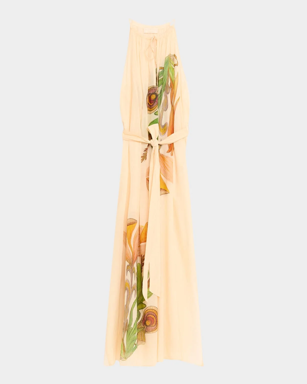 Cut from lightweight cotton, Ulla Johnson's "Elara" sun dress coverup is richly patterned with the surreal botanicals of celebrated Art Brut painter Anna Zemankova Split neckline with optional selfties Sleeveless Selftie sash belt Hem falls below the knee Slipover style Cotton Made in Portugal