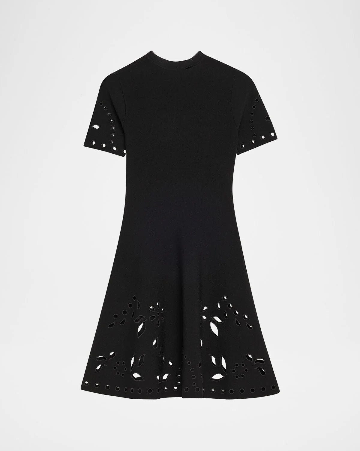 - Ulla Johnson "Fania" knit mini embellished with eyelet detailing - High neckline - Short sleeves - A-line silhouette - Hem falls above the knee - Slipover style - Viscose/spandex/polyester - Dry clean - Imported
