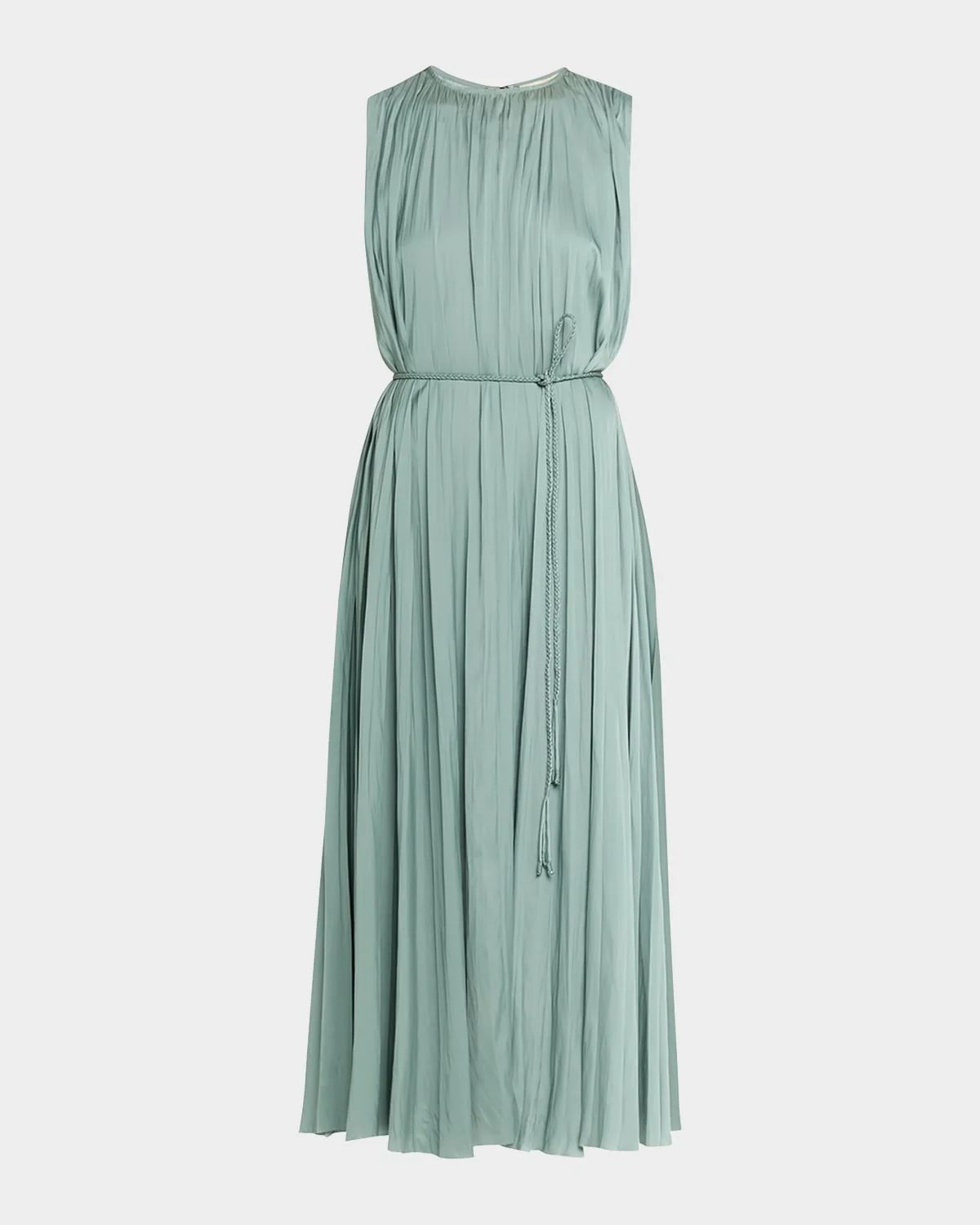 Ulla Johnson "Fianna" dress is crafted from smooth plisse satin that's gracefully pleated throughout and can be worn fluid and loose or with the braided belt for more definition. Round neckline Sleeveless Selftie belted waist Wide Aline silhouette Hem falls below the knee Invisible back zip Polyester Imported