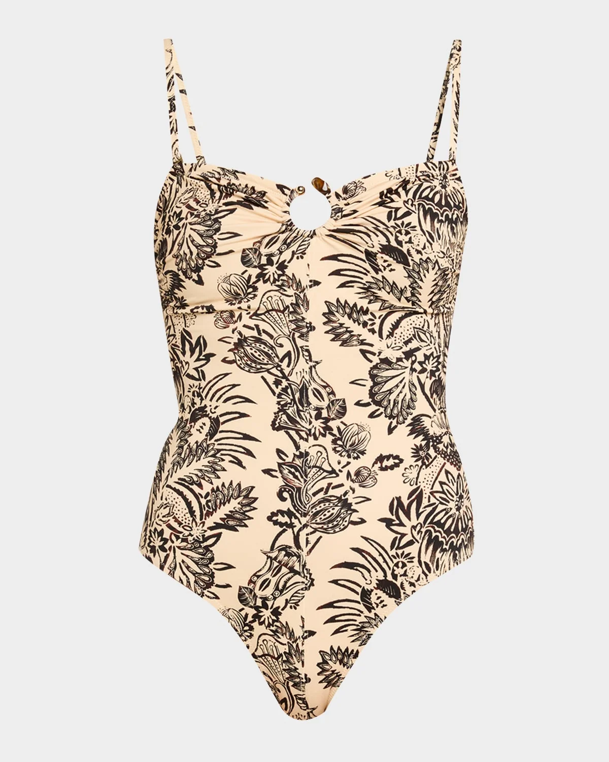 Ulla Johnson "Hydra Staples" bandeau onepiece swimsuit in a chic floral print features a central ring accent Strapless neckline Removable, adjustable straps Moderate seat coverage Nylon/polyamide/elastane Made in Portugal